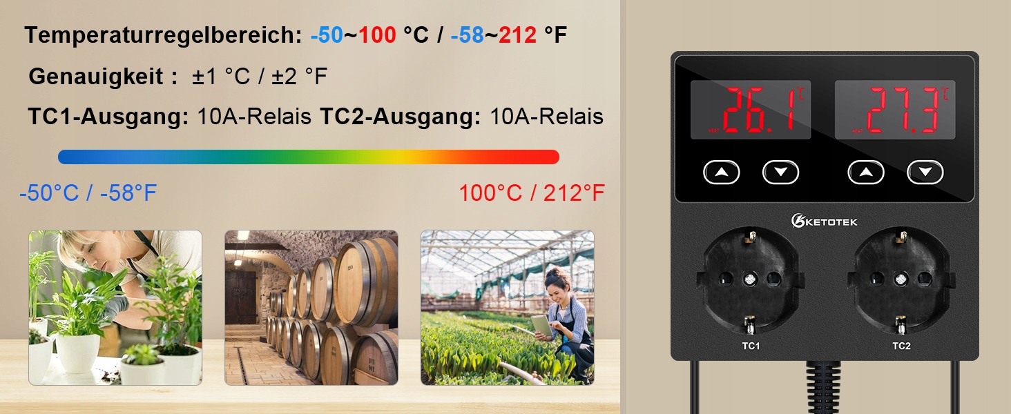 Два ретрансляционных выхода 10a: благодаря 2 независимым водонепроницаемому датчикам температуры NTC, охлаждению и нагреванию можно включать и выключать с использованием того же регулятора температуры, что дает больше возможностей в нормальном сроке жизни. Широкий диапазон регулировки температуры: -58 ~ 212 ℉/-50 ~ 100 ℃, высокая точность ± 2 ℉/± 1 ℃.