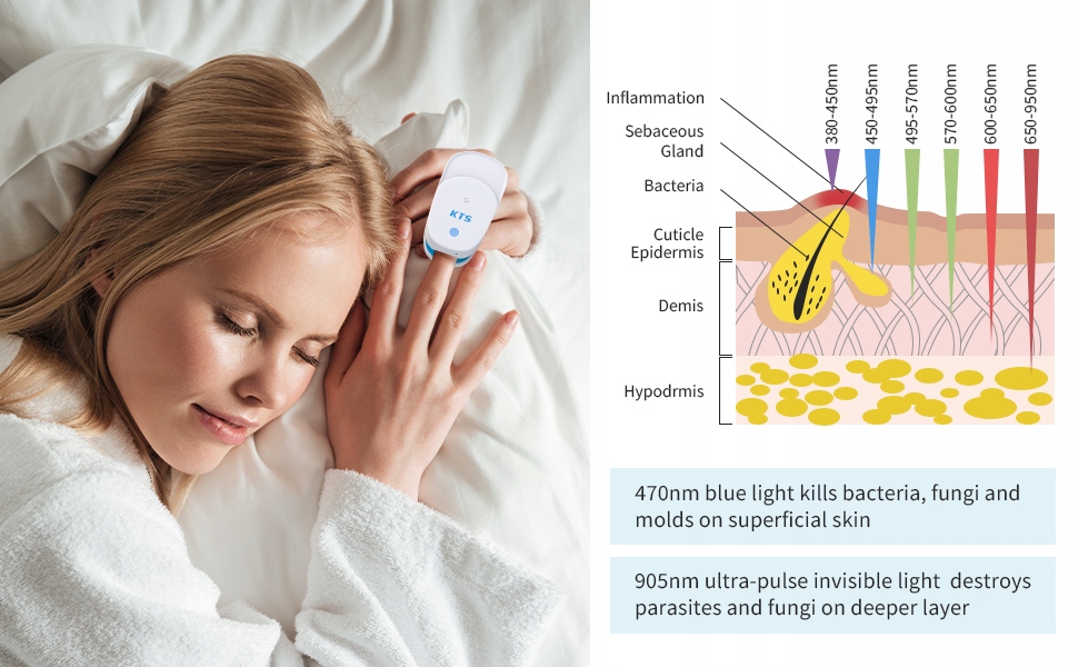Идеальное решение 470 нм и 905 нм (невидимый): Длины волн синего светодиода в том же диапазоне 400–470 нм были обозначены как «собственные противомикробные вещества». Синий светодиодный свет может фотодинамически инактивировать устойчивые к спектру провода (грамположительные и отрицательные) и грибки. Этот эффективный характер синего светодиодного света используется как для здоровья, так и для красоты. Суперимпульсный невидимый свет с длиной волны 905 нм может взаимодействовать с ионами гемоглобина и насыщать кислородом оксигенированные участки, влияя на эффект лечения.