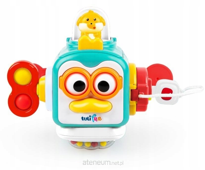 Щелкните, щелкните, что происходит, когда вы поворачиваете ключ или нажимаете кнопку? Бирюзовый пингвин в форме куба развлечет вашего малыша разными способами, ведь каждая его стенка – это отдельная сенсорная игра! Есть собачка, выпрыгивающая из створки, зайка на скользящей лямке, вращающаяся погремушка и гремящий элемент с шариками, которые нужно нажимать. Дополнительно пингвин оснащен пищащим клювом, при нажатии игрушка двигает глазами.