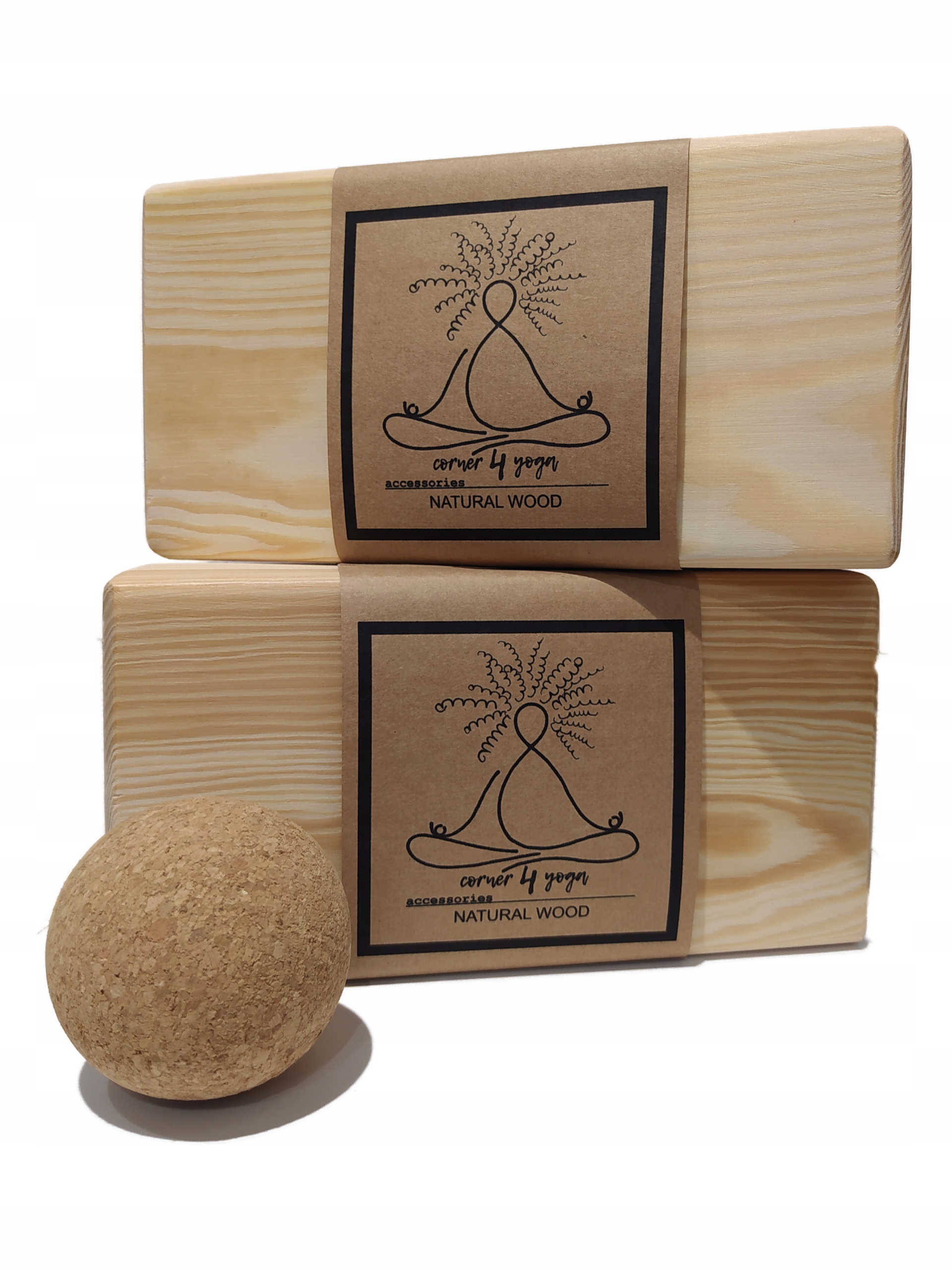 Набор из двух кубиков для йоги Corner 4 Yoga из соснового дерева + массажный мяч из натуральной пробки.
