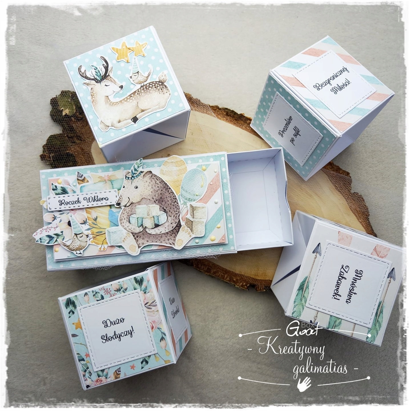 Коробка имеет складки для удобного складывания и отверстия для резинки. В сложенном виде коробка помещается в специально разработанный ящик, который необходимо приобрести отдельно. В ящике плотно помещается 5 коробок, свободно - 4 декорированных коробки или 3 :)