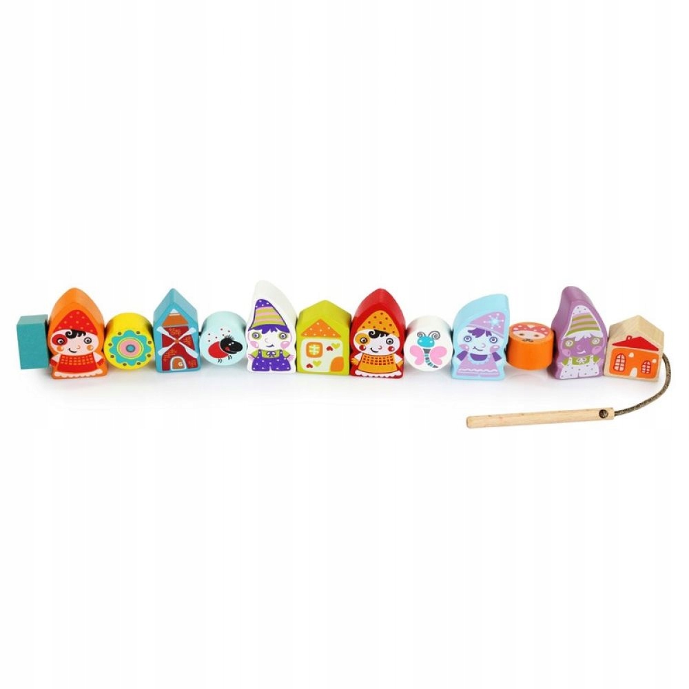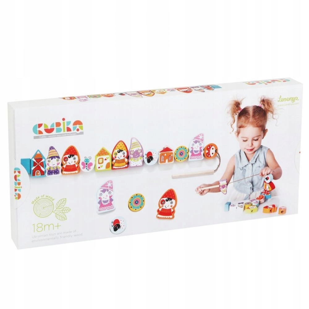 Деревянная игрушка Кубика состоит из тринадцати красочных фигурок, соединенных веревочкой с деревянной ручкой для удобного захвата. В каждом блоке есть сквозное отверстие, через которое ребенок может продеть веревочку, благодаря чему он сможет расположить фигурки по своему усмотрению.