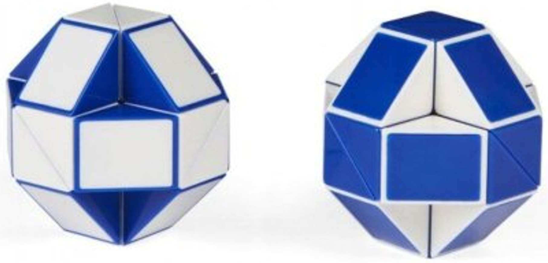 Этот кубик в форме змеи представляет собой интересную игру. вариация оригинального кубика Рубика. Змея может вращаться вокруг любого элемента, меняя форму. Пазл состоит из двух отдельных частей синего и белого цвета, которые можно соединять.