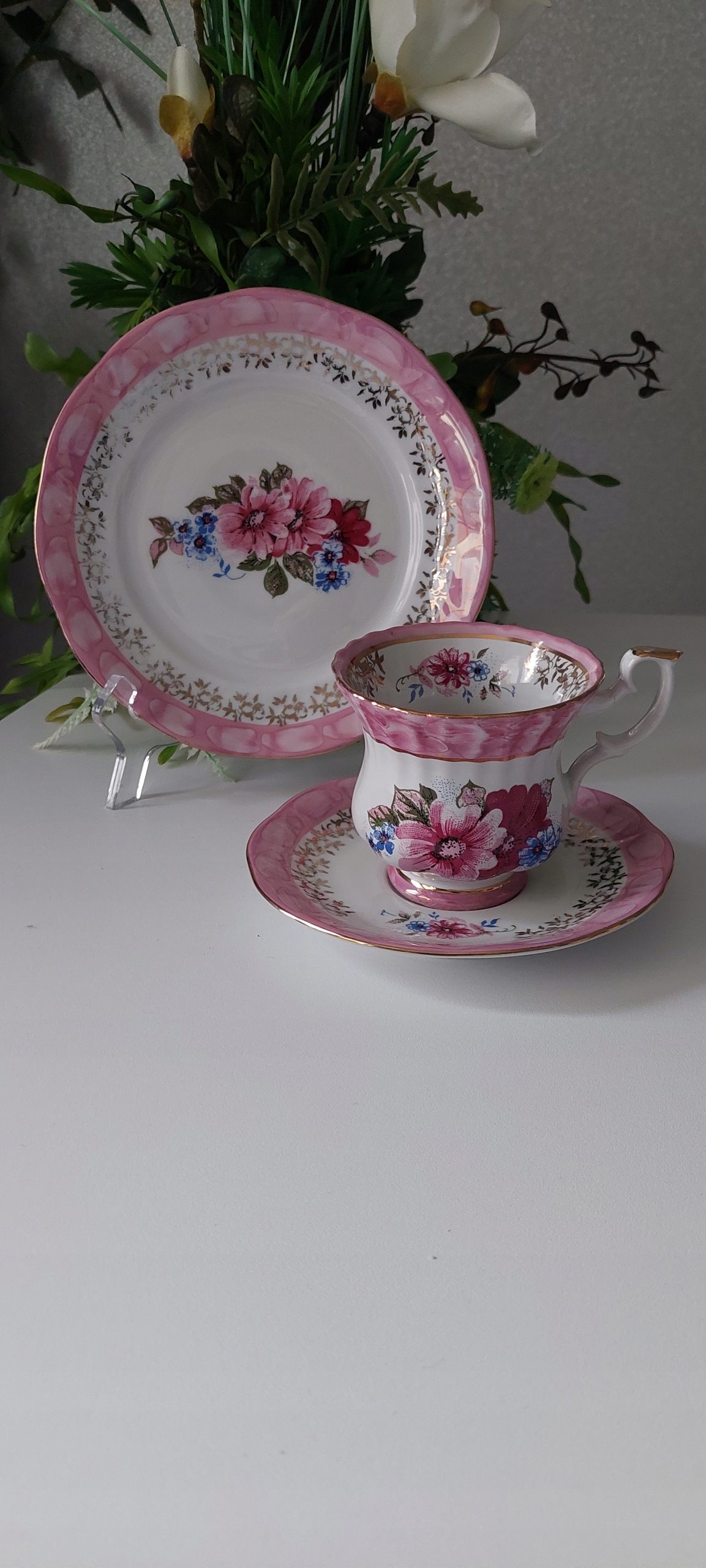 Трио с размерами: высота чашки 8см, диаметр наполнителя 9см, диаметр тарелки для чашки 14см, диаметр десертной тарелки 19см.