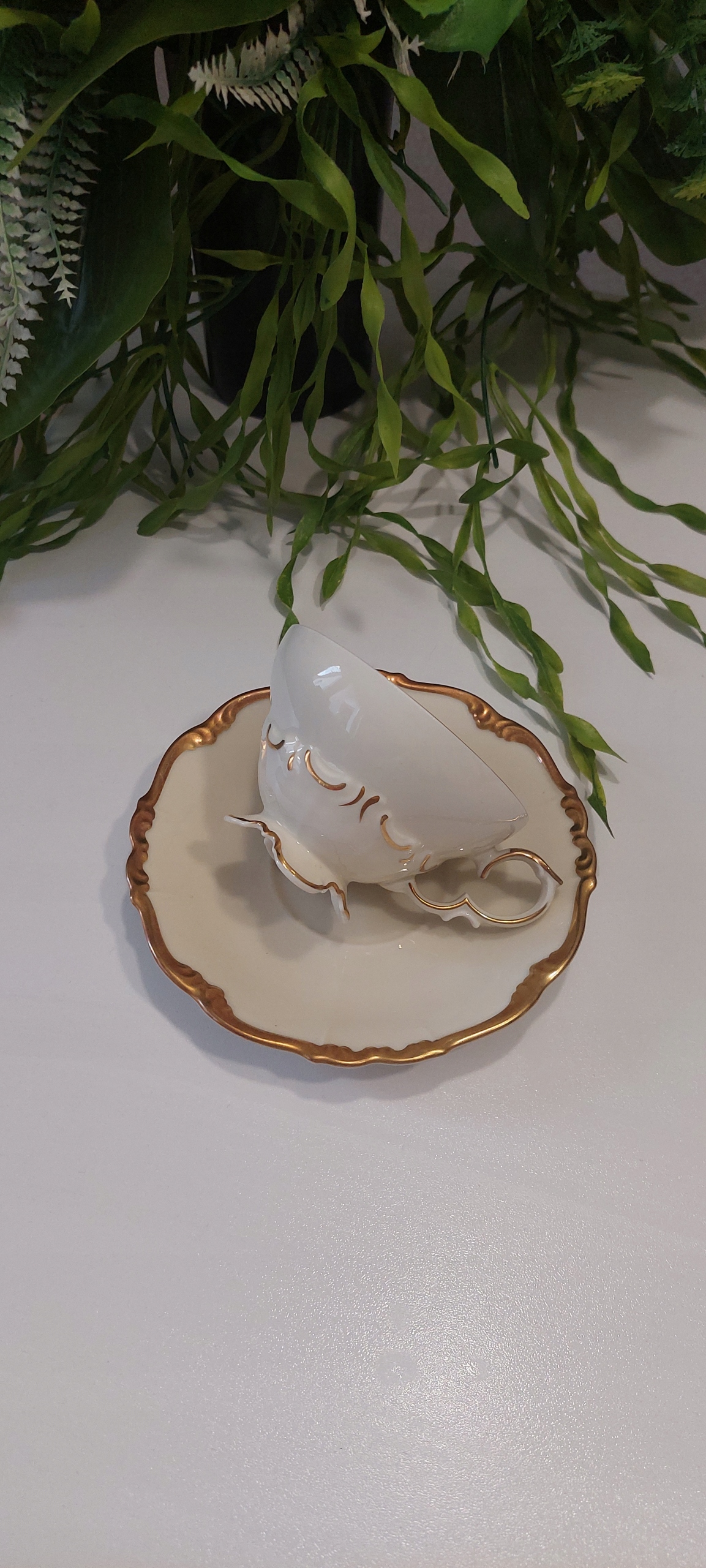 Чашка EDELSTEIN цвета экрю в очень хорошем состоянии, размеры: высота чашки 6см, диаметр наполнителя 10см, диаметр тарелки 15см.
