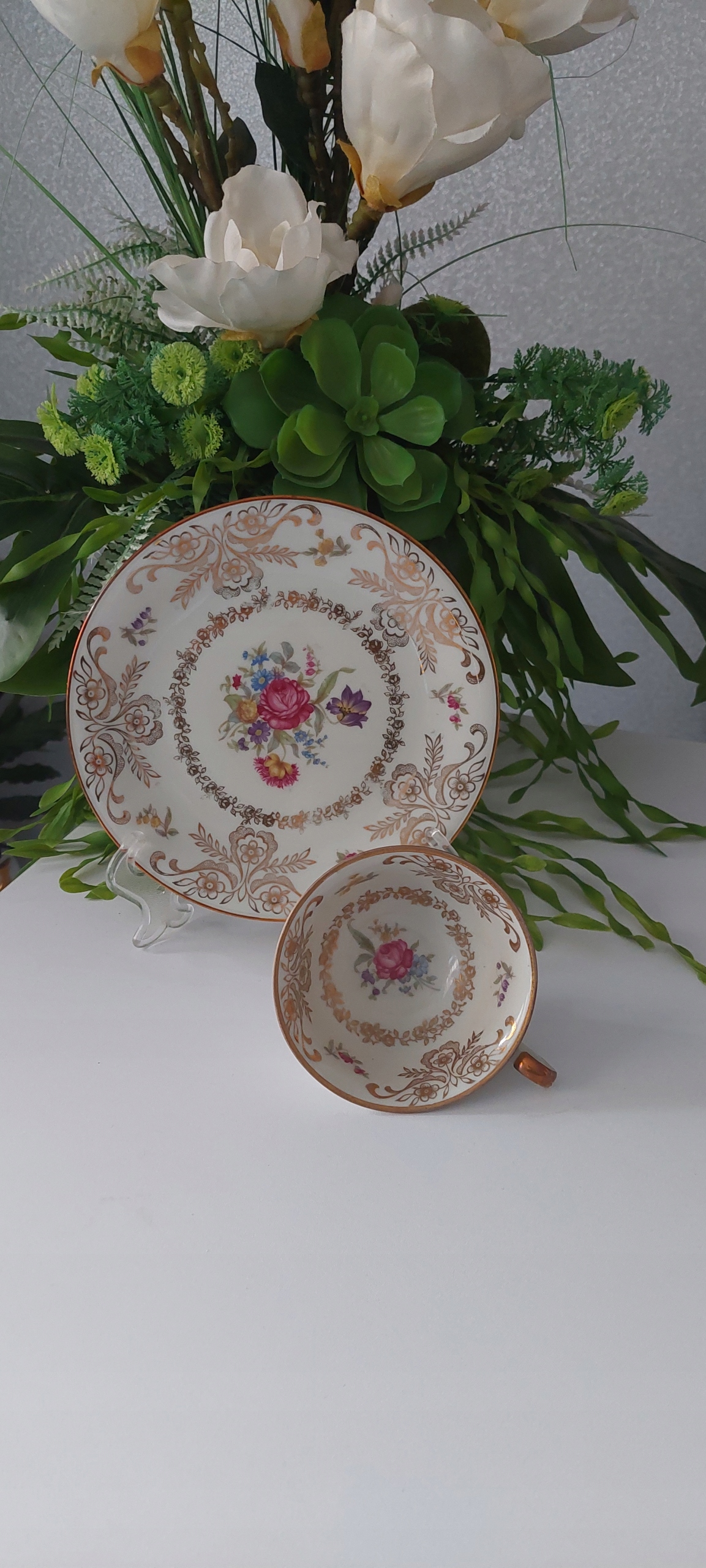 Чашка с десертной тарелкой (без тарелки под чашкой), цвет экрю, размеры чашки: высота 5 см, диаметр наполнения 10 см, диаметр десертной тарелки 20 см.