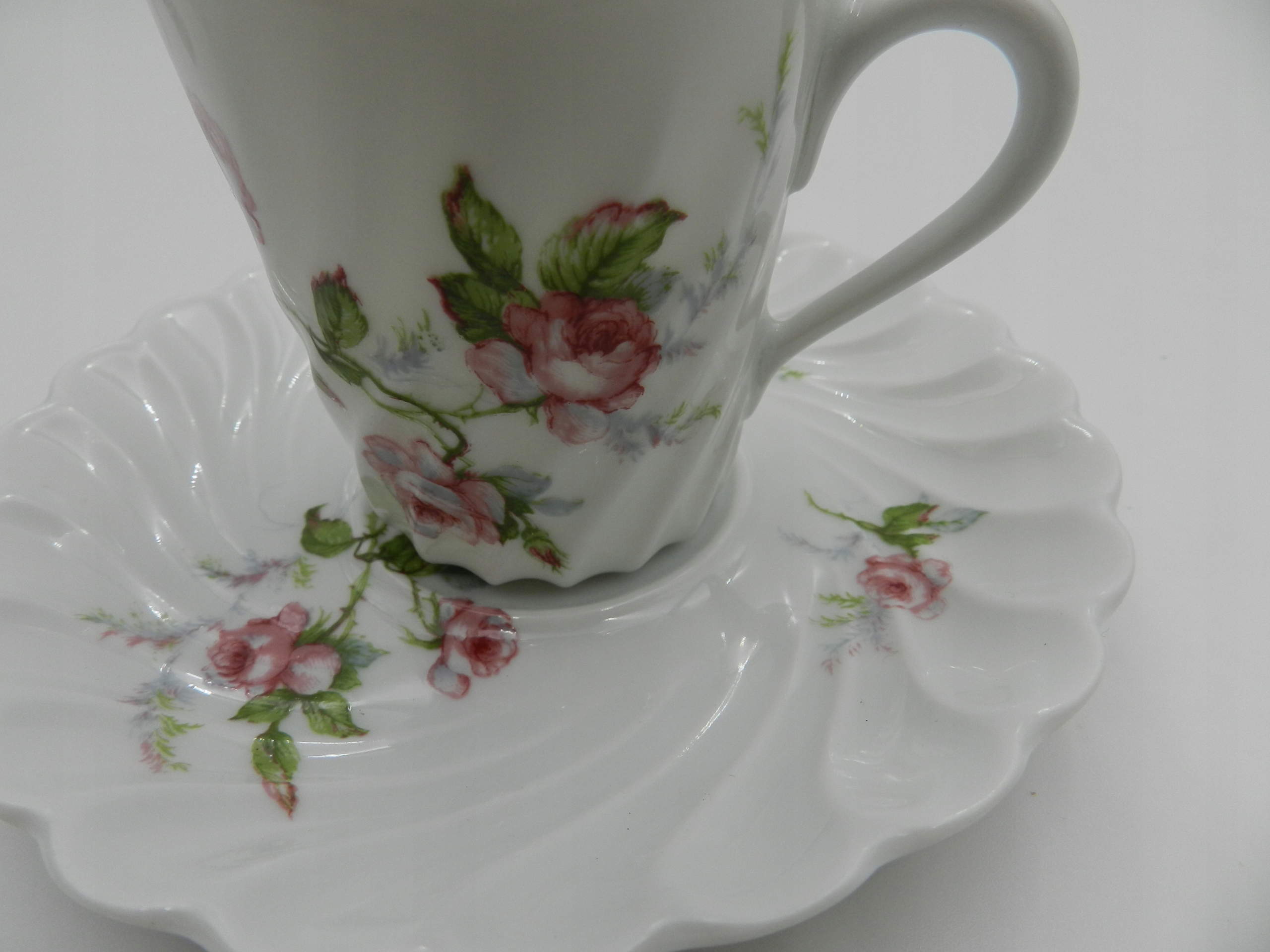 Исключительно нежный, прекрасно пропускающий свет, белоснежный фарфор. Все это украшено тонким цветочным орнаментом, который прекрасно гармонирует с используемыми диагональными каннелюрами. Маленькое произведение искусства для вашей коллекции.