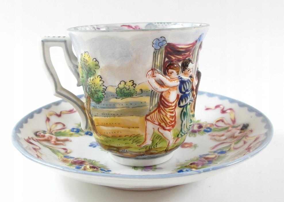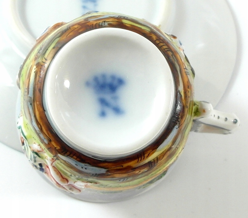 Предмет аукциона — красивая старинная чашка для эспрессо. Белый фарфор, декорированный в стиле Каподимонте, узор на чашке и тарелке четко выпуклый. Синий подглазурный знак фабрики Ernst Bohne Söhne, Рудольштадт в Германии, 1901-1937 гг.
