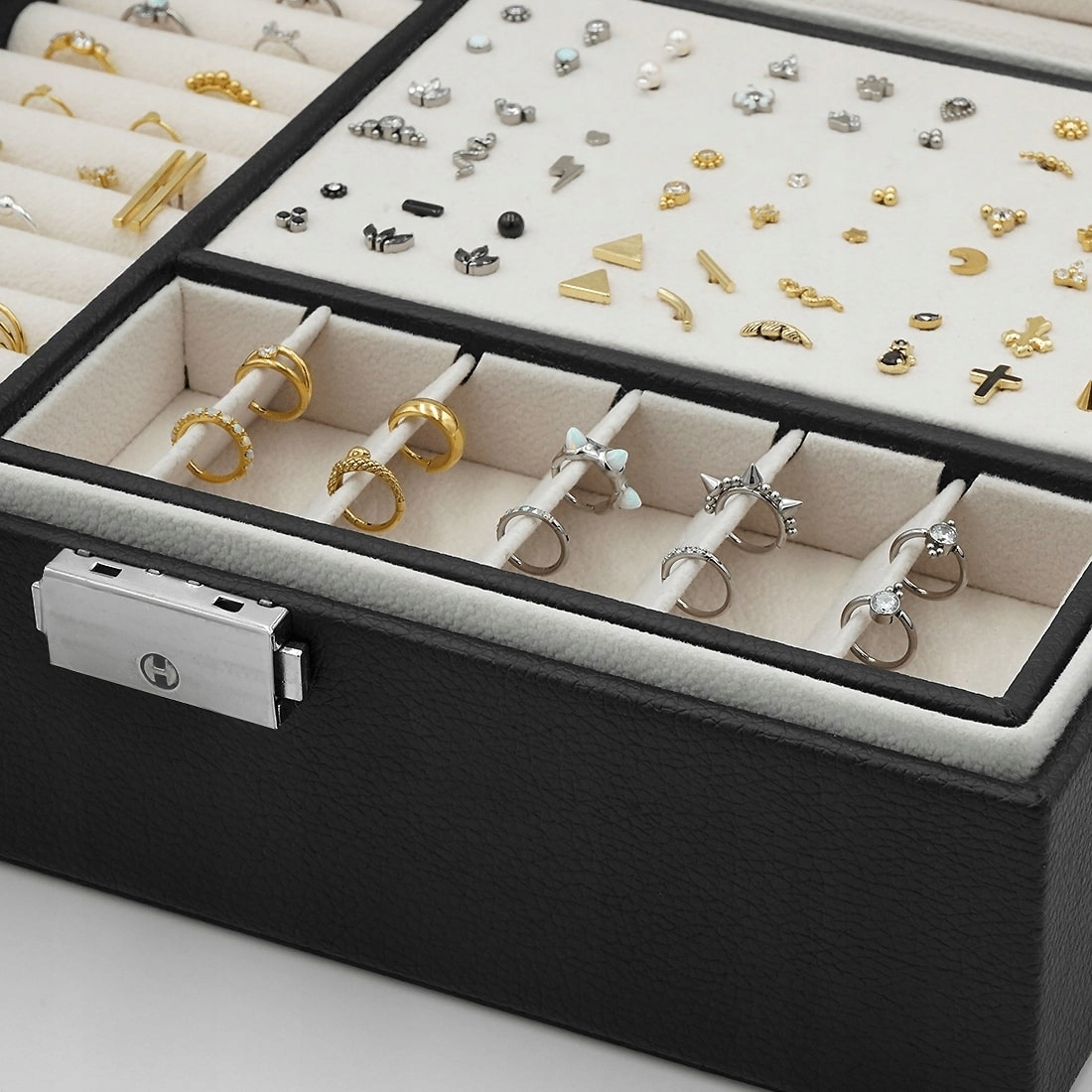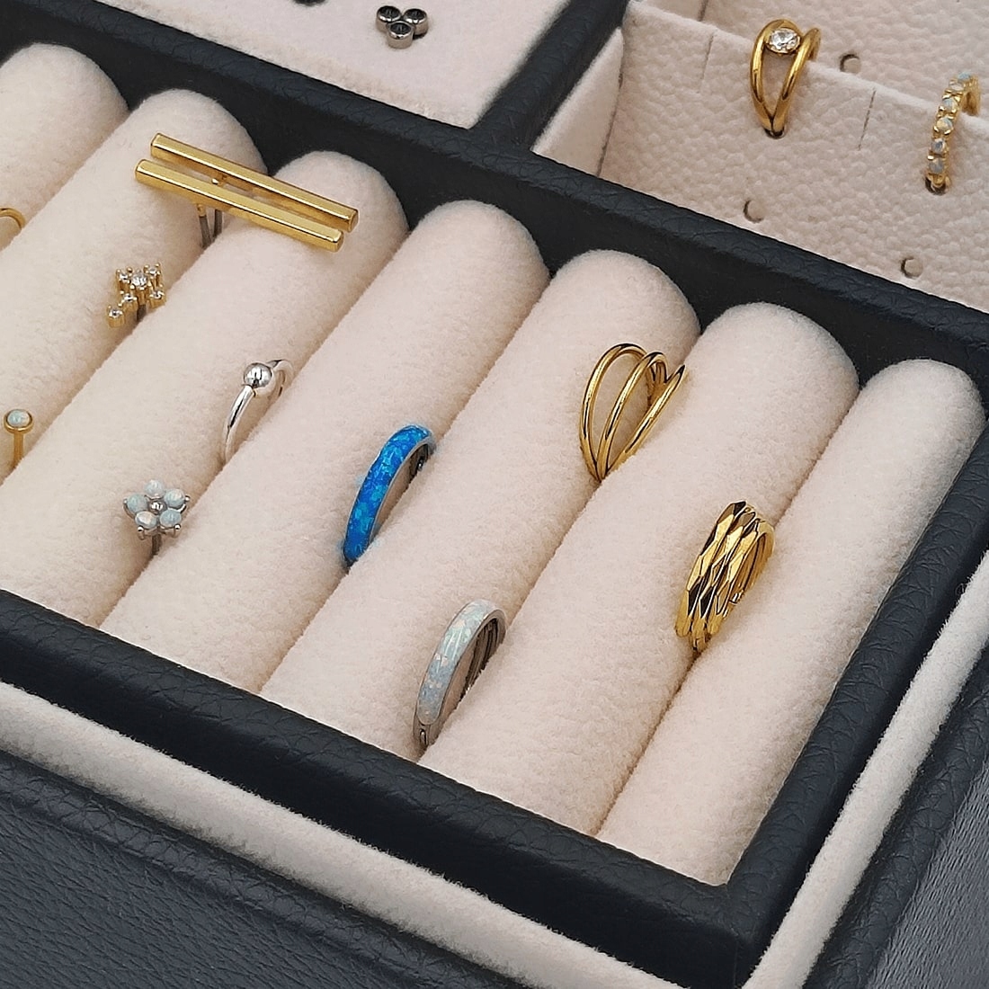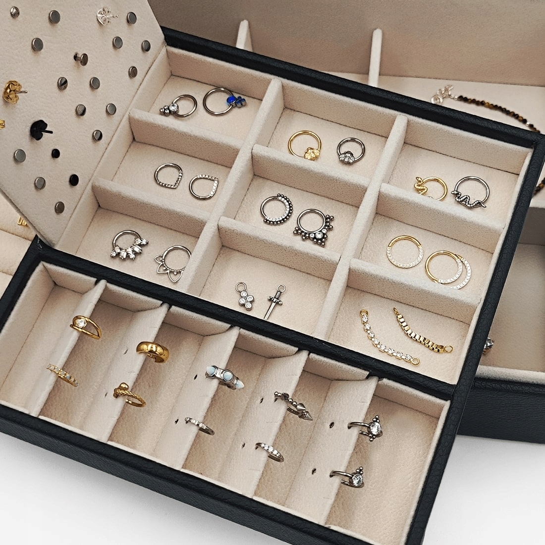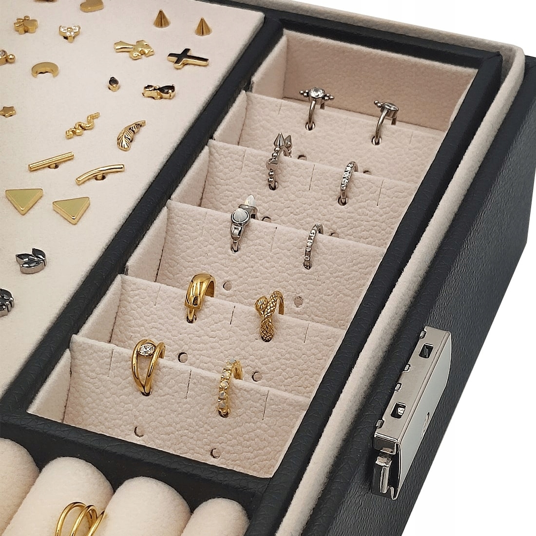 Большая шкатулка-органайзер для ваших украшений. Откройте для себя элегантность и функциональность в одном: наш черный футляр для сережек станет идеальным решением для всех любителей красивых аксессуаров. Он не только защитит ваши сокровища, но и позволит содержать их в идеальном порядке. Он был предназначен для хранения сережек, колец и ожерелий. Для ожерелий и цепочек предусмотрено отдельное место, чтобы они не запутывались. Специальная вставка позволяет идеально организовать серьги, а отделения позволяют разместить кольца или кольца для пирсинга. Теперь вы можете наслаждаться своей коллекцией украшений во всей ее красе, всегда готовой к ношению.
