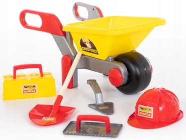 В наборе есть все необходимое для творческой деятельности, развивающей воображение и координацию движений. Маленькие каменщики найдут здесь большую, прочную тачку, защитную каску, мастерок, мастерок каменщик и большую форму с ручкой - кирпичом, а также есть лопата с деревянной ручкой. Тачка оснащена большим колесом и удобными ручками. Чего еще можно хотеть?