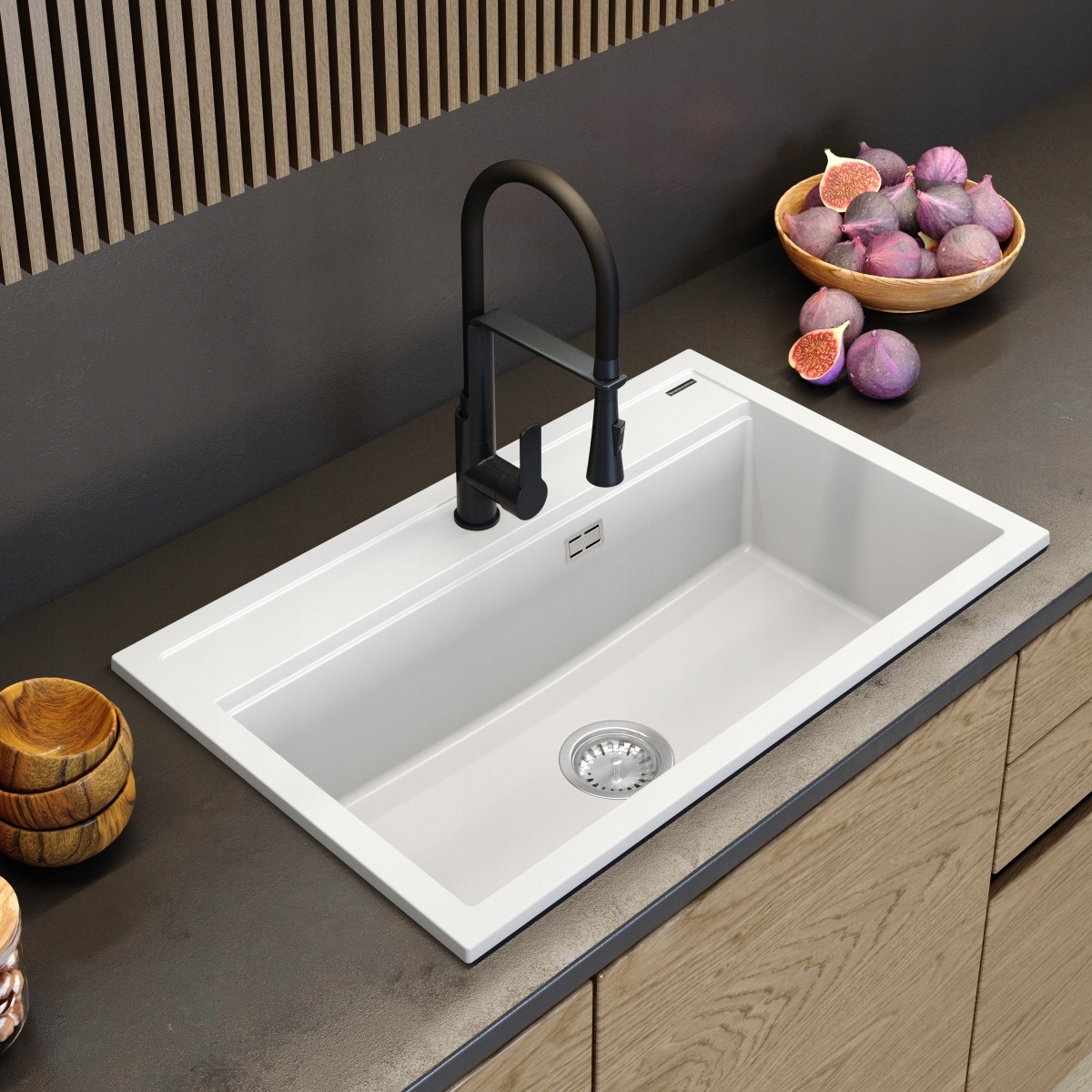ASTI — ультрасовременная гранитная мойка с одной чашей, минималистическую форму которой нарушает сифон с прямоугольным переливом.< /п >