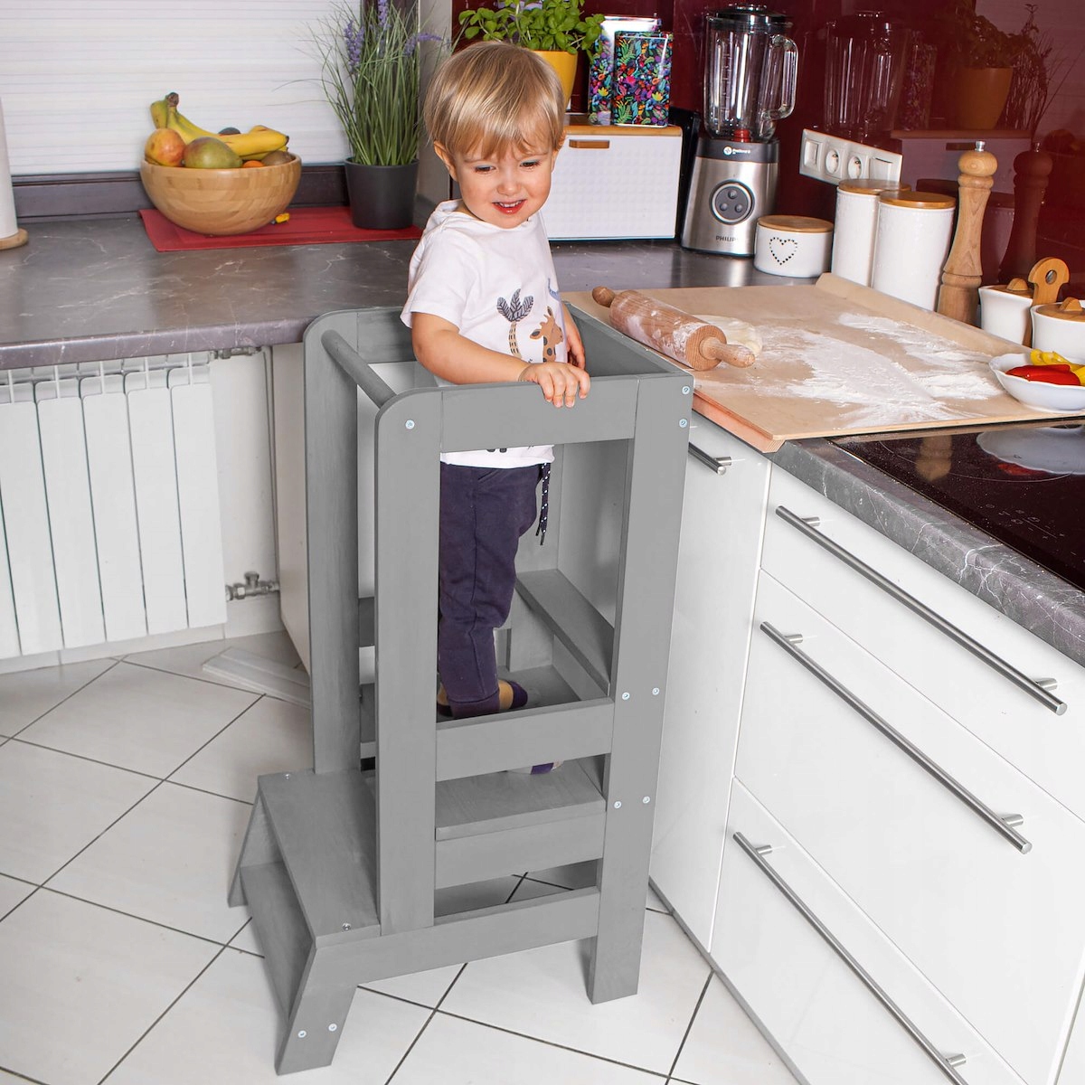 Kitchen Helper также оснащена 2 ступеньками, благодаря которым ребенок может добраться до платформы< /b сам по себе >. Маленьких детей могут поместить внутрь родители. Стоит отметить, что помощник очень устойчив и прочен, что еще больше повышает безопасность его использования. Сама регулируемая платформа имеет ограничители внизу, которые не позволяют платформе перемещаться под ногами малыша.