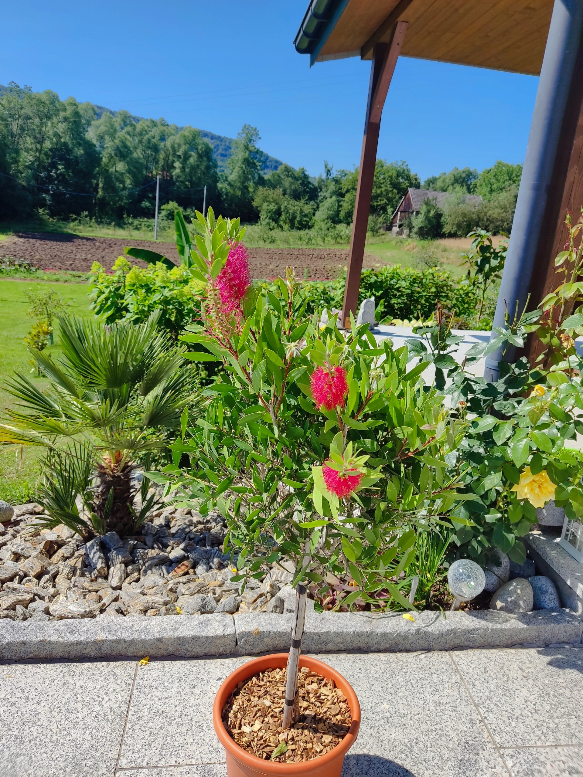 Лимонная кружка — растение из Австралии. У него ярко-красные соцветия, напоминающие бутылочную щетку, и зеленые удлиненные листья, которые при растирании в руках источают сладкий лимонный аромат. Выращивается в контейнерах.