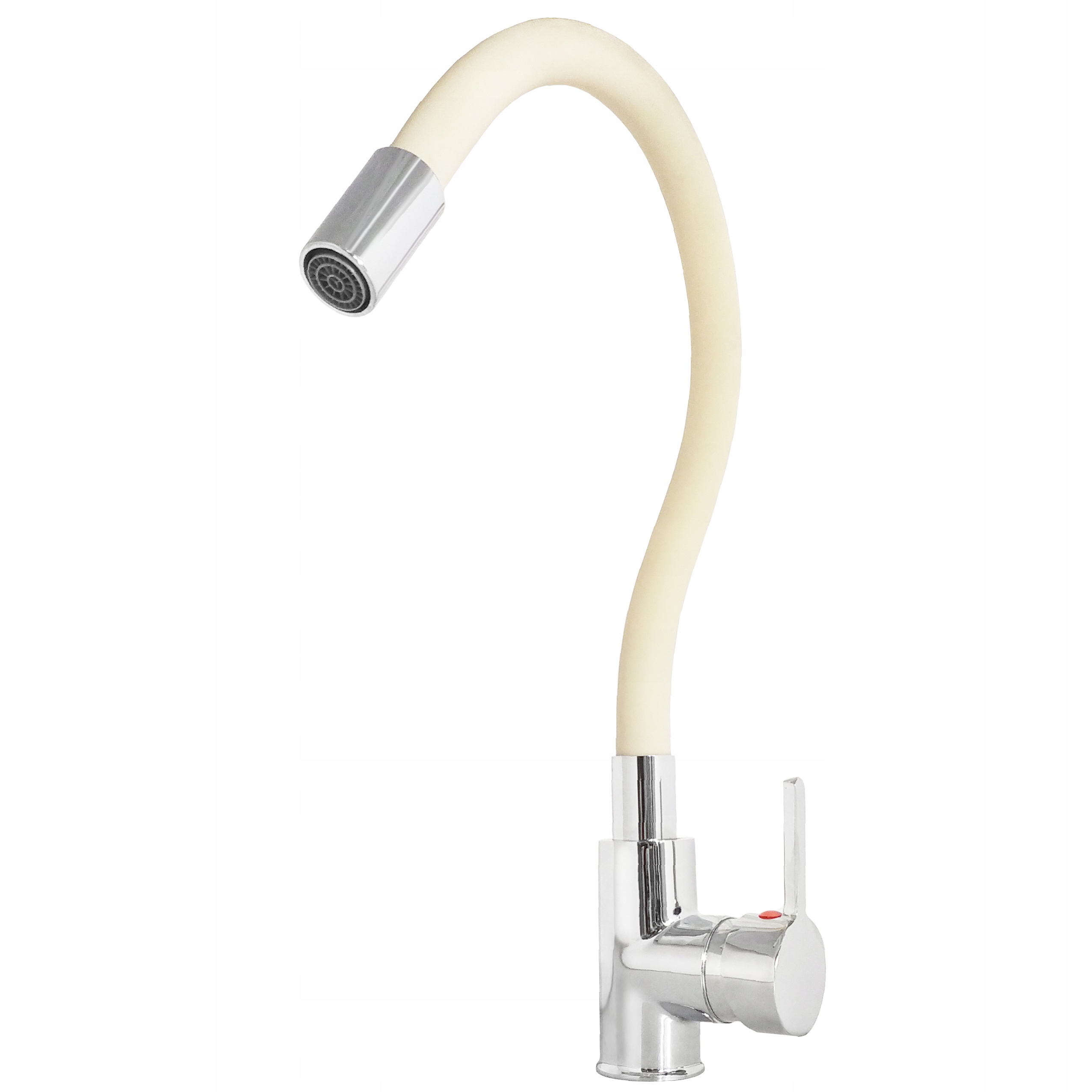 Хромированный массивный кран с гибким изливом бежевого цвета, запоминающим форму. Шланг легко выдерживает вес даже интенсивного потока.