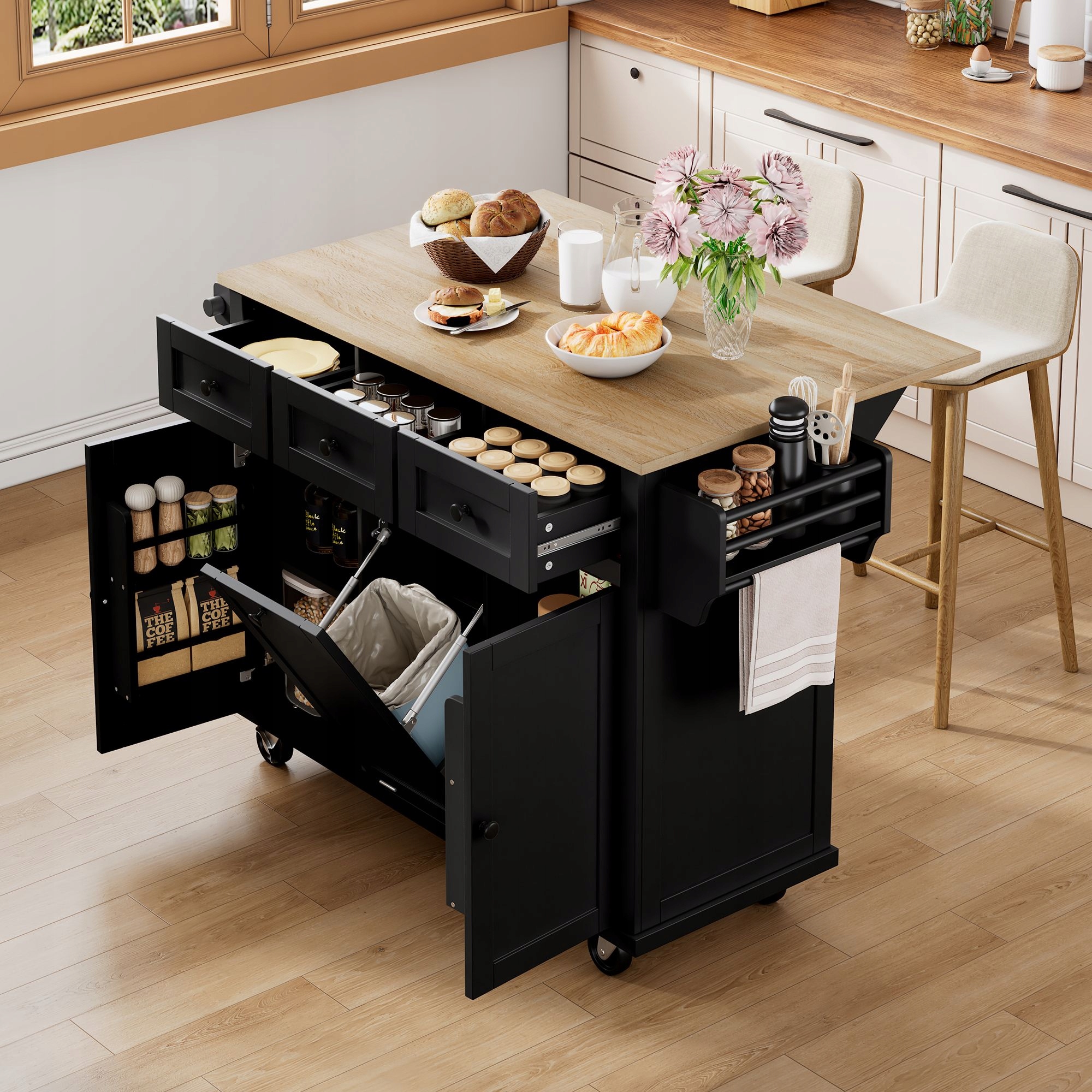 Кухонный остров на колесах, выдвижной кухонный остров с обеденной зоной, мусорным баком и ящиками, мобильный кухонный остров, идеально подходящий для кухни и столовой (черный)