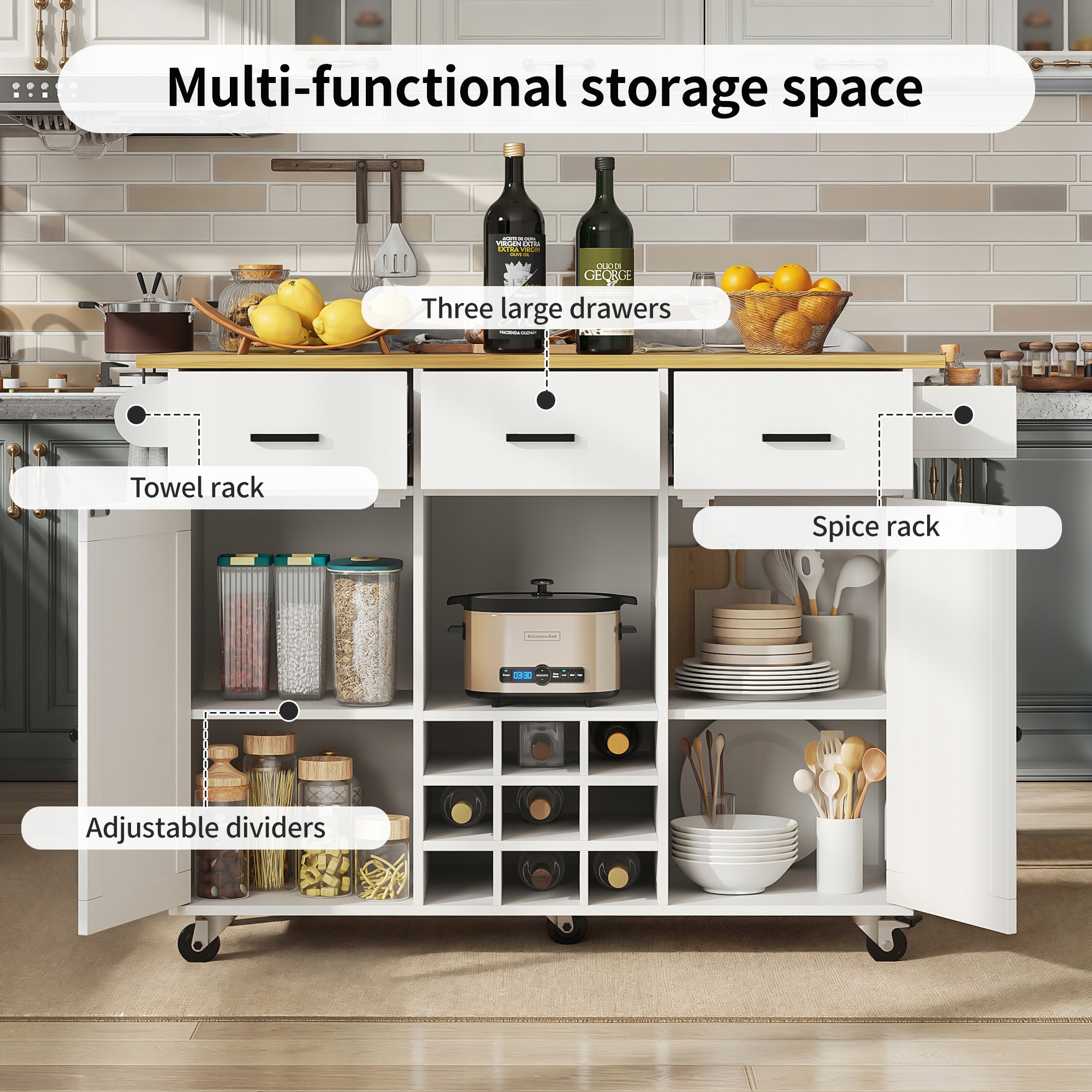 Практическое хранение: оснащено 3 ящиками, 2 дверями шкафа, рампом для бутылок вина, открытые полки, организатор специй и вешалка для полотенец. Благодаря этому коляска предоставляет много места для столовых приборов, специй и других кухонных аксессуаров.