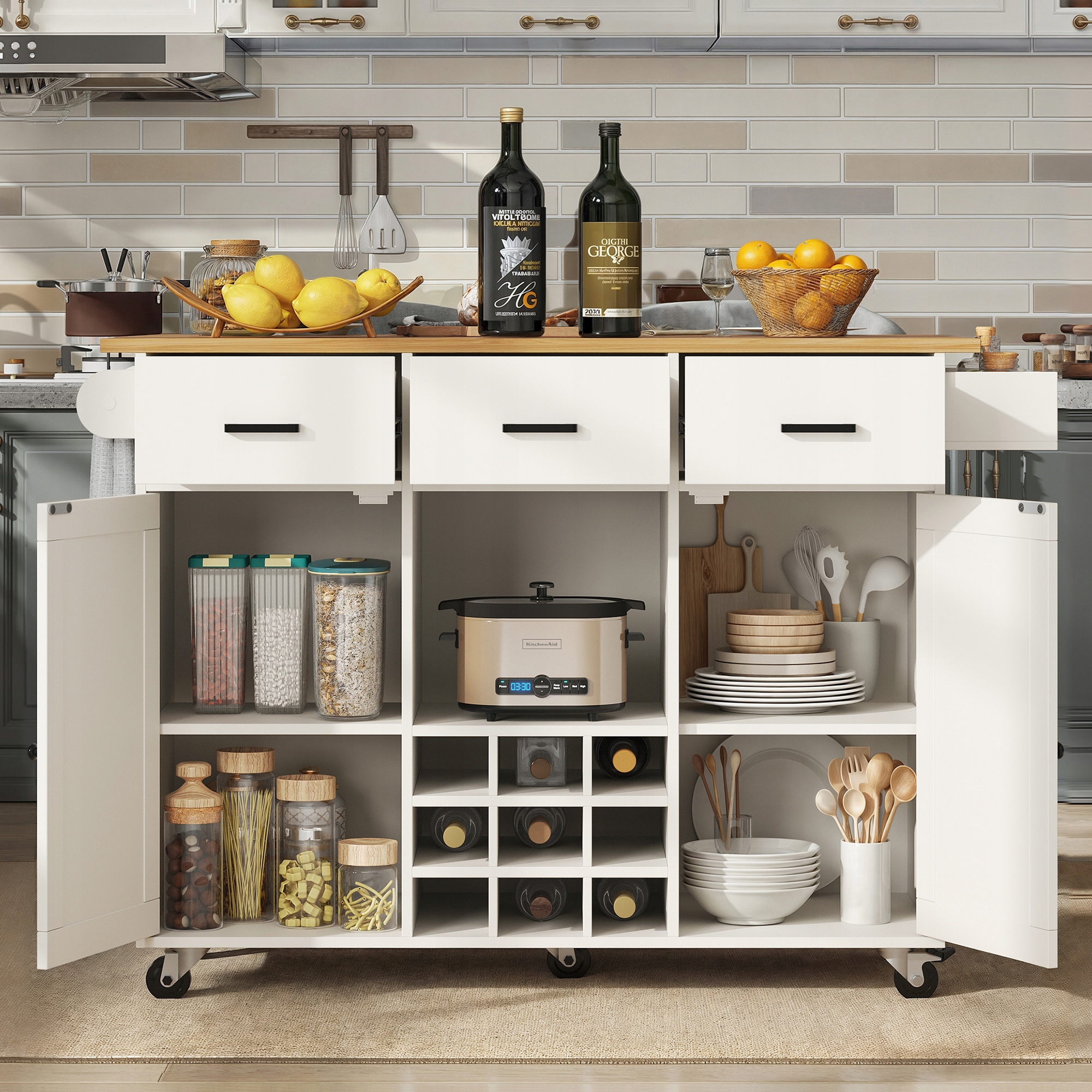 полки внутри шкафа можно отрегулировать в 3 положениях, что позволяет хранить объекты на разных высотах. Эта кухонная коляска имеет 3 ящика, 2 дверь шкафа, винный перегородка и открытые полки, предлагающие много места для хранения.