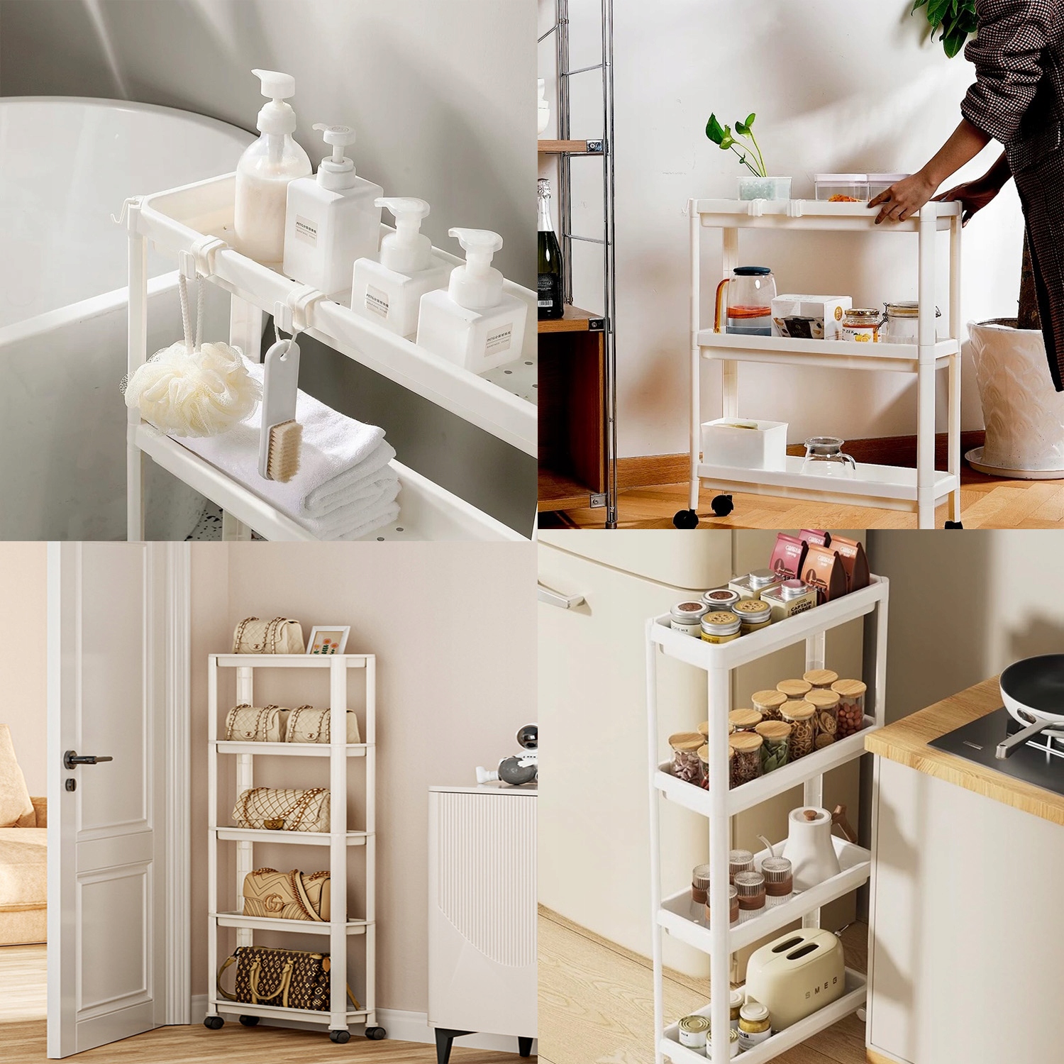 Кухня: Вы можете поместить на стену или рядом с шкафом для хранения бутылок со специями, шпателями, палками и другой кухонной посудой, чтобы получить легкий доступ во время приготовления, а также может использоваться для размещения чистящих средств, используя узкий пробел пространства на раковине. Узкое место рядом с туалетом и шкафом для ванной комнаты для полотенца, зубных щетков, геля для душа, косметики и других туалетных принадлежностей, или может быть помещено в угол стены, чтобы увеличить поверхность хранения.