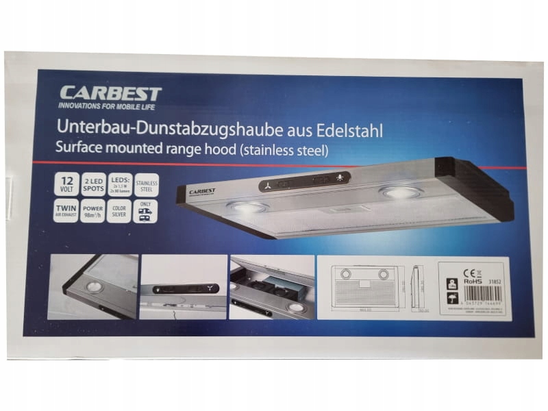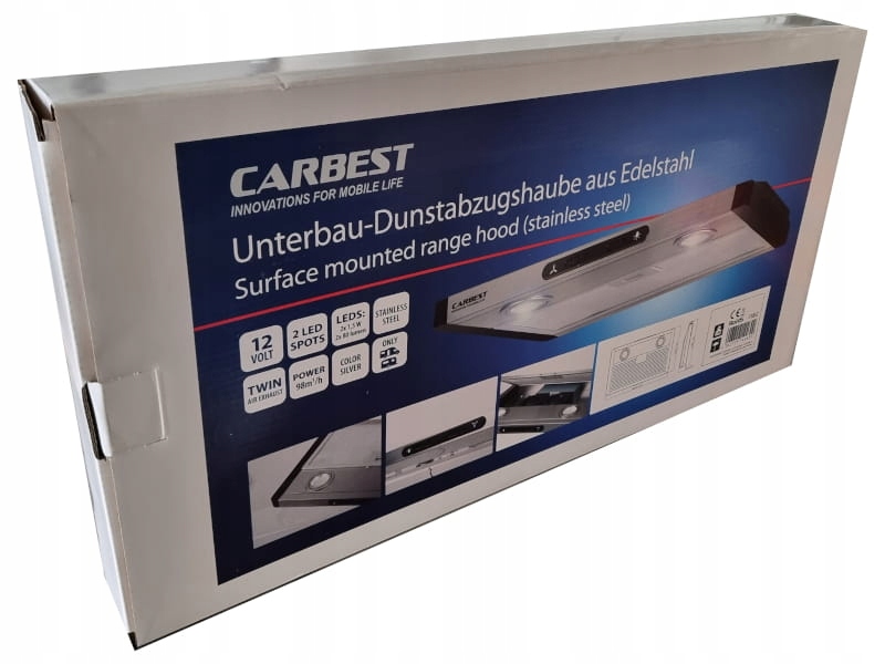 Вытяжка кухонного капота 12 В от Carbest. Идеально подходит для караванов и кемперов. Вытяжка изготовлена из нержавеющей стали и имеет встроенное освещение.