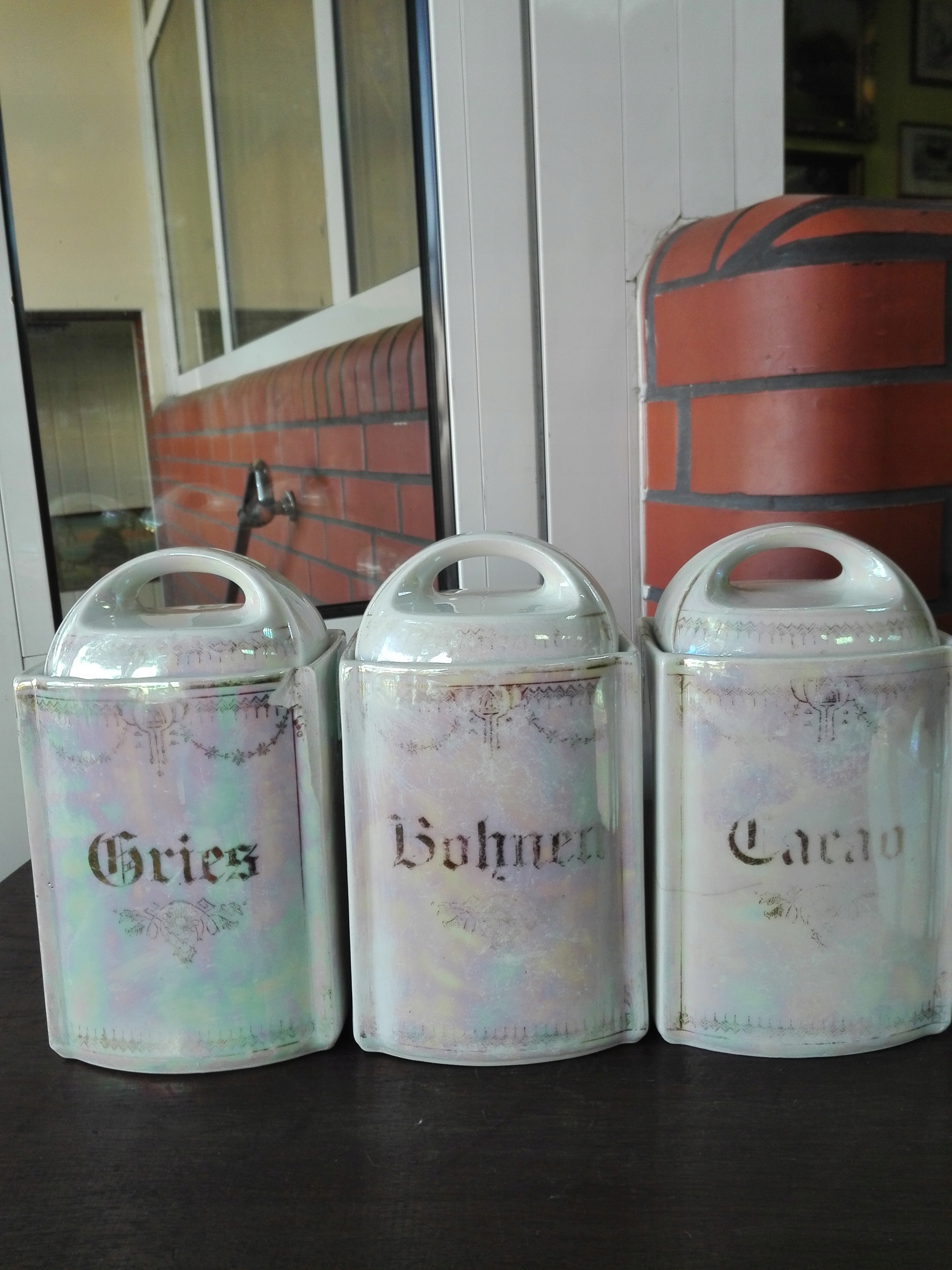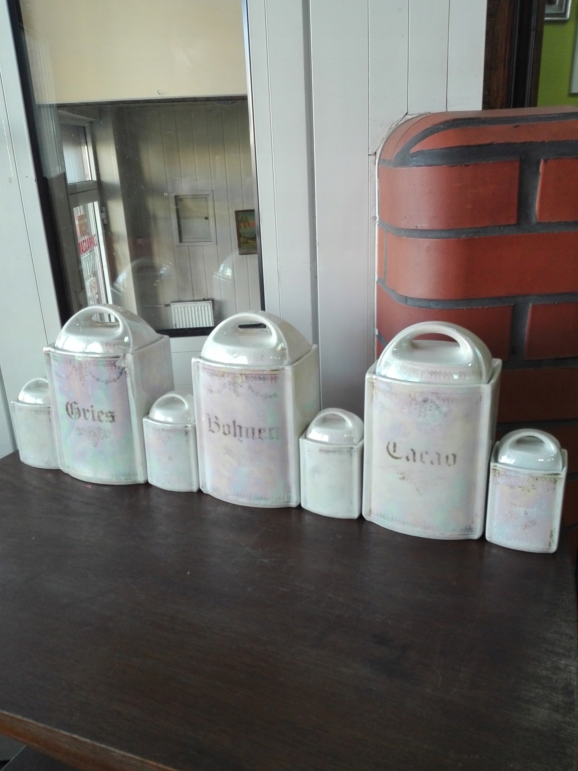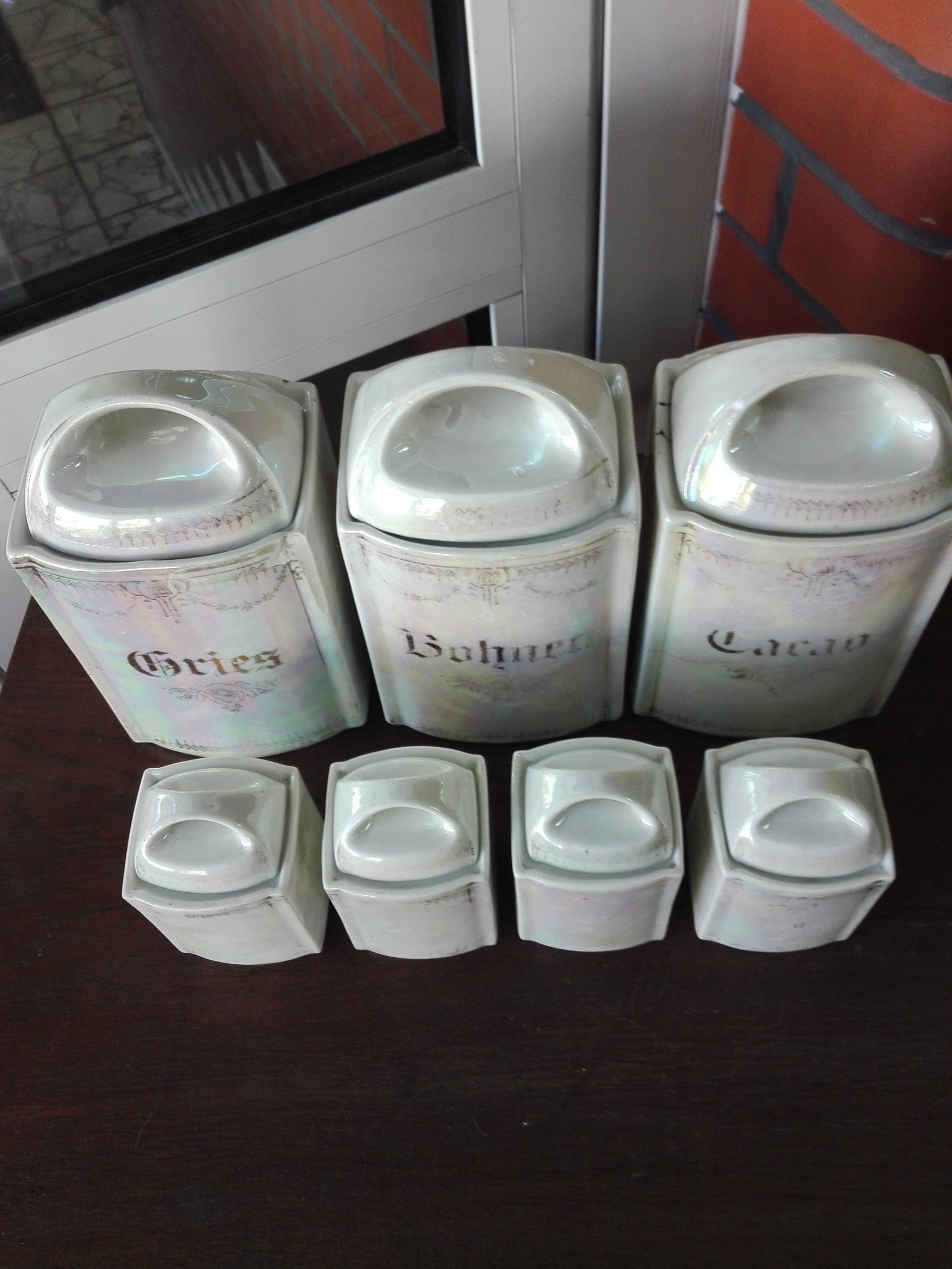 - художественные кухонные контейнеры, созданные около 1900 года. Простые формы и декорации искусства с использованием метода штампа. Три больших контейнера около 20 см и размеры горы 11,5 см х 10,5 см. Полем Второй имеет дефект на краю контейнеры спереди и задней части выпущены, все они имеют крышки. Всего 7 контейнеров