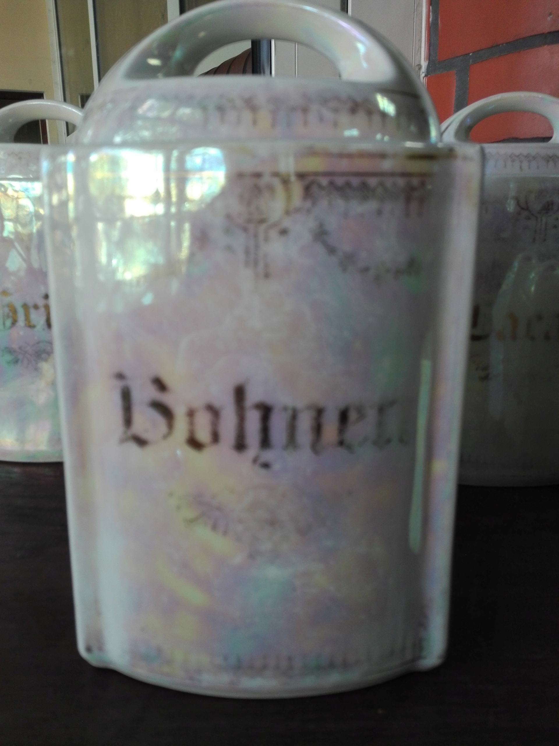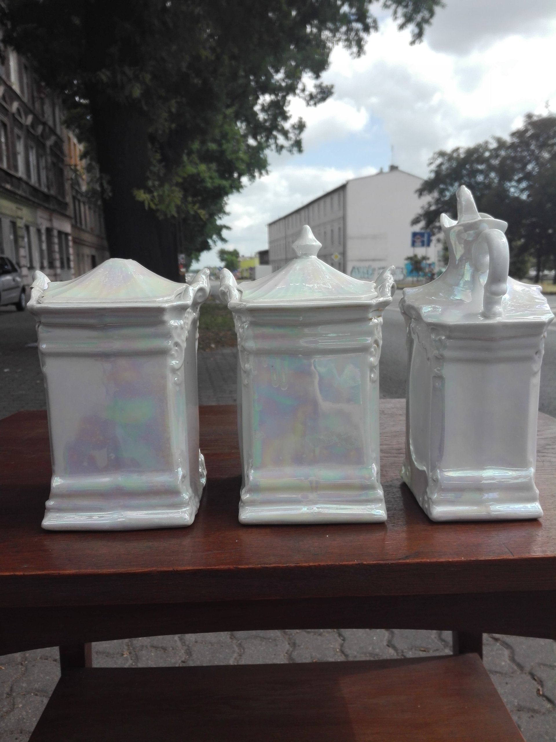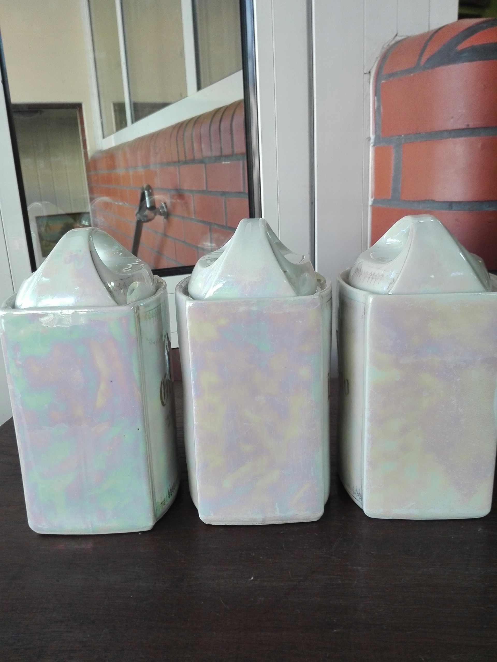 - художественные кухонные контейнеры, созданные около 1900 года. Простые формы и декорации искусства с использованием метода штампа. Три больших контейнера около 20 см и размеры горы 11,5 см х 10,5 см. Полем Второй имеет дефект на краю контейнеры спереди и задней части выпущены, все они имеют крышки. Всего 7 контейнеров