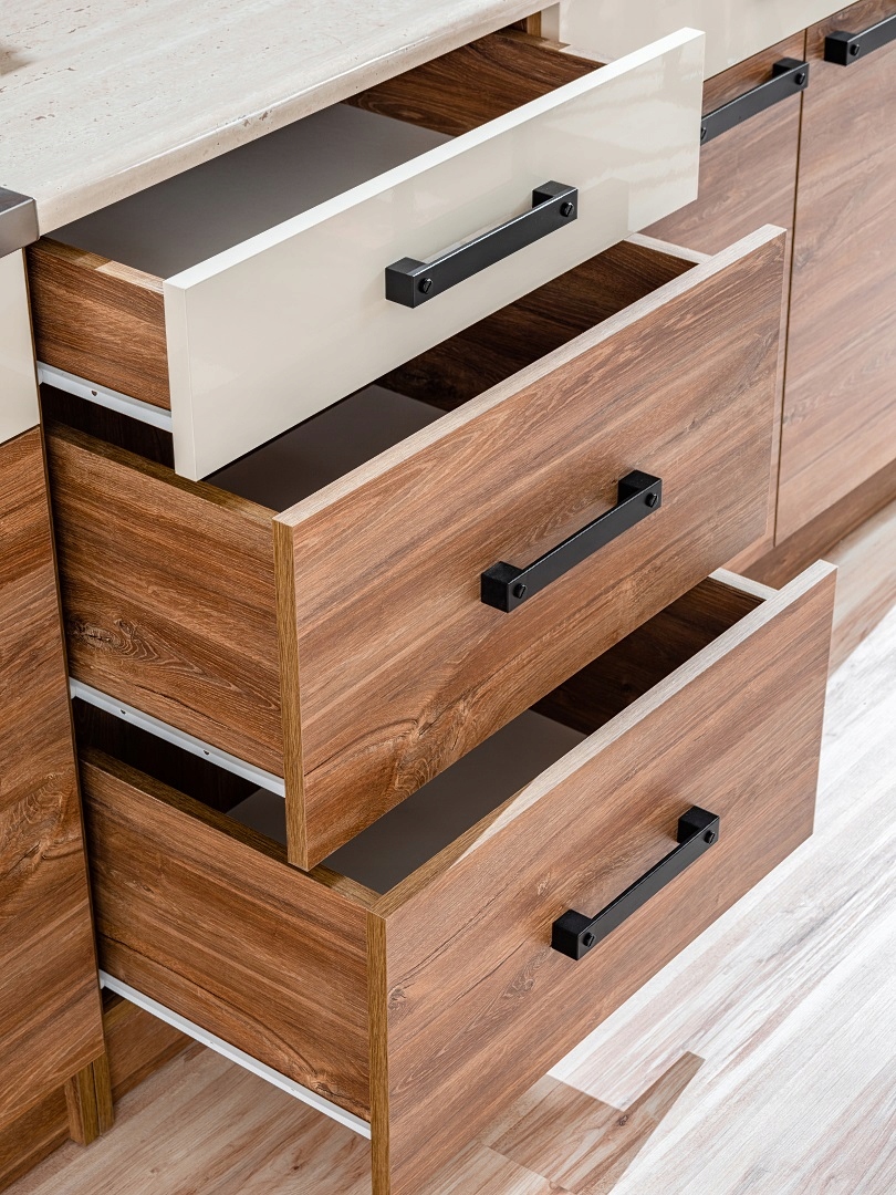 - Стандартно поставляется с обрезкой по длине шкафа, т. е. 80 см, 60 см и 40 см