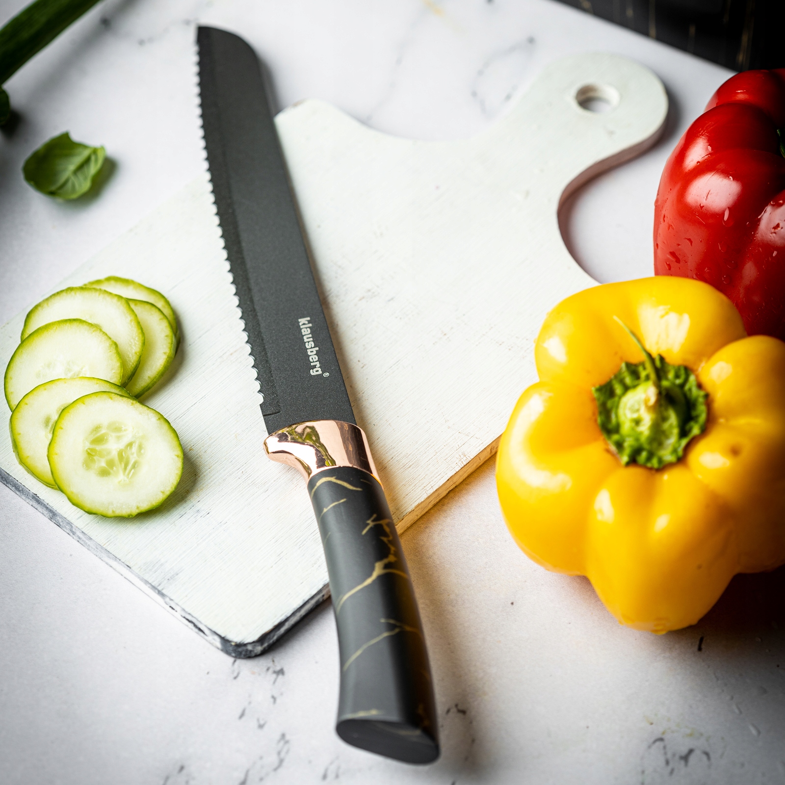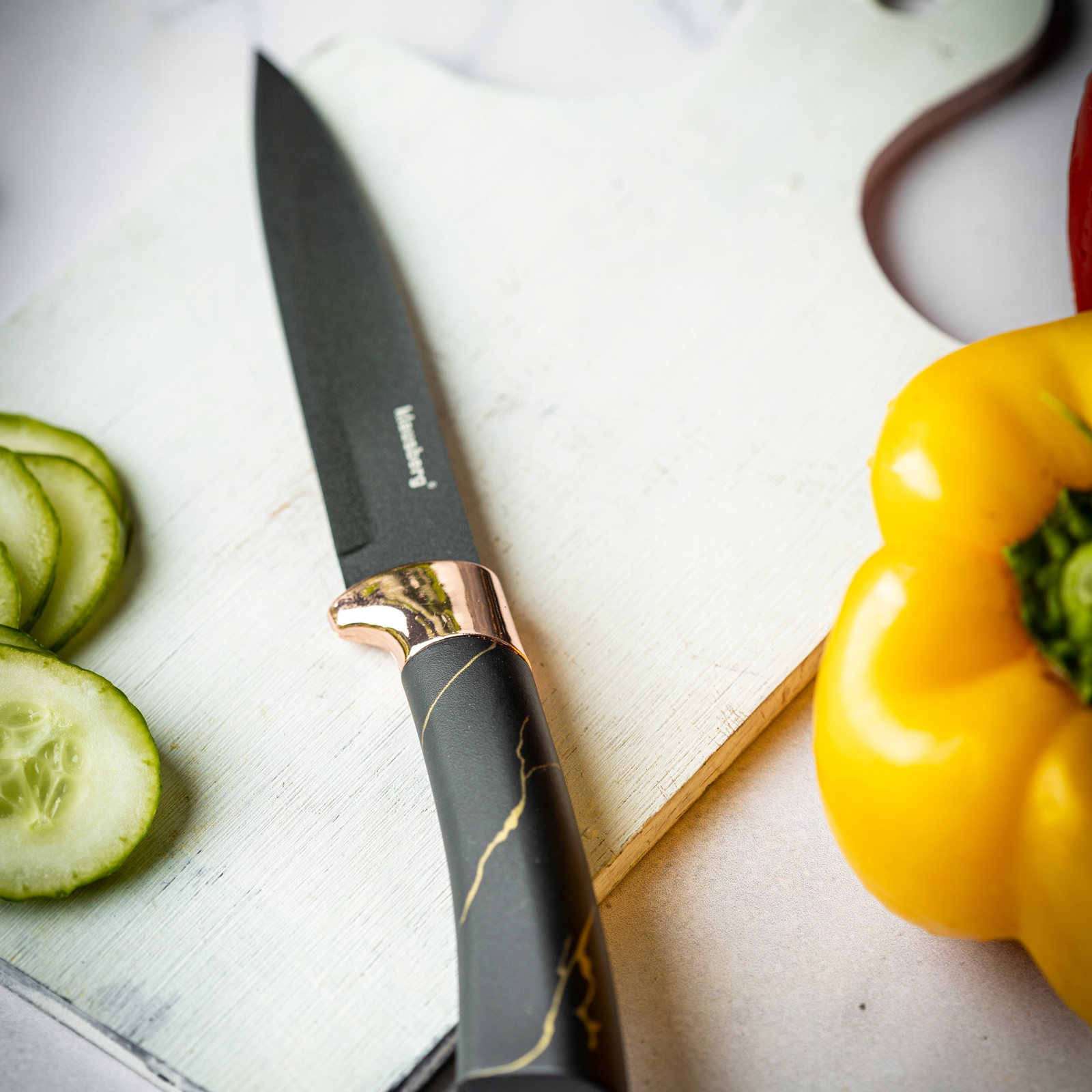 Добавьте элегантность и функциональность к вашей кухне благодаря нашему эксклюзивному набору ножа в уникальном черном мраморном блоке. Удобный набор используется, благодаря тому, что ежедневная приготовление становится чистой удовольствием.
