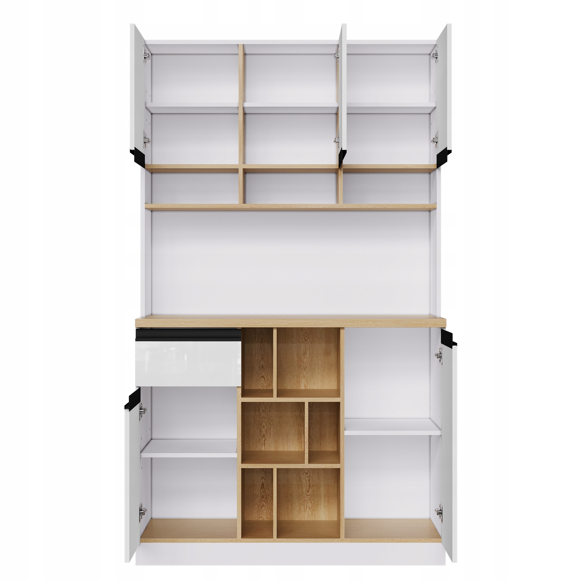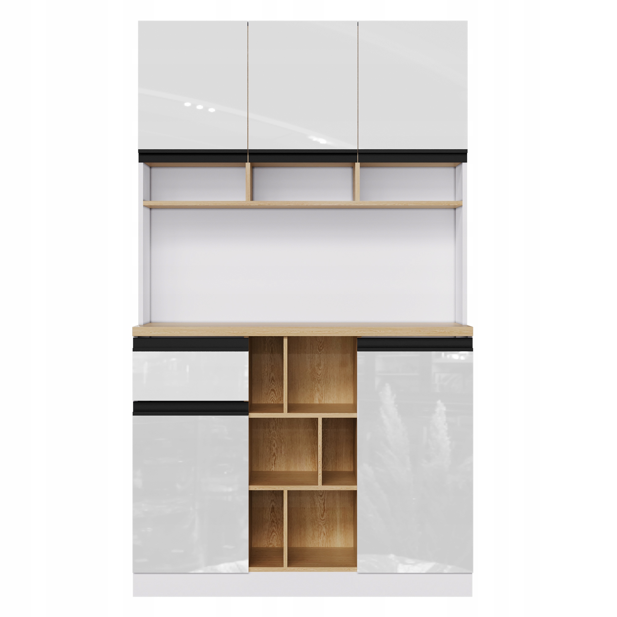 - – этот шкаф сочетает в себе современную эстетику и практичную функциональность. Глянцевые белые дверцы и черные алюминиевые ручки придадут элегантный и неподвластный времени стиль вашей кухне, столовой или гостиной.