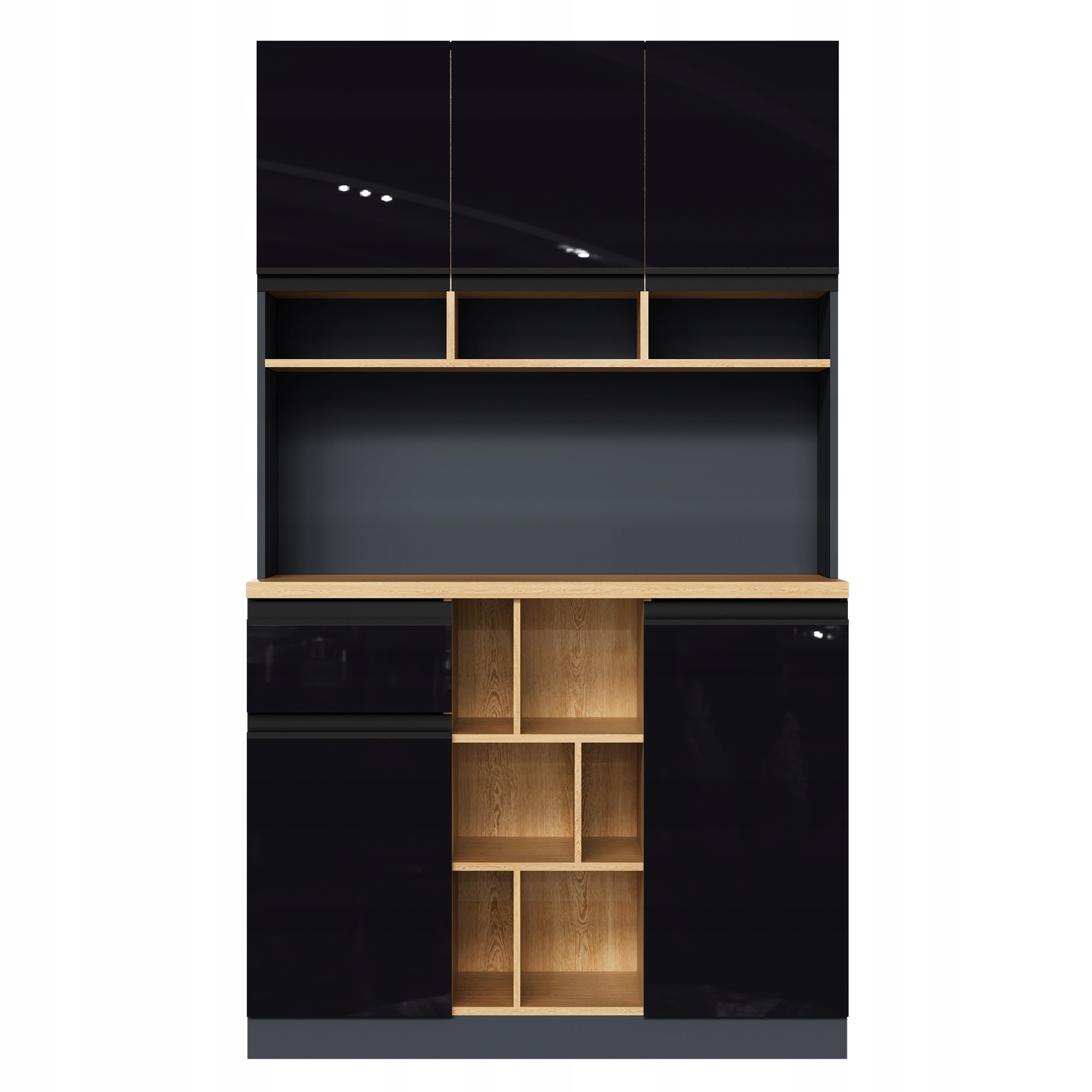 - – Все дверцы и ящики имеют глянцевые фасады, которые легко чистятся и устойчивы к влаге. Черные алюминиевые ручки обеспечивают удобство работы и придают современный вид.