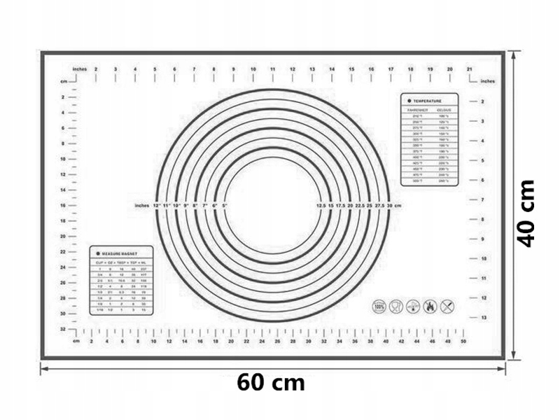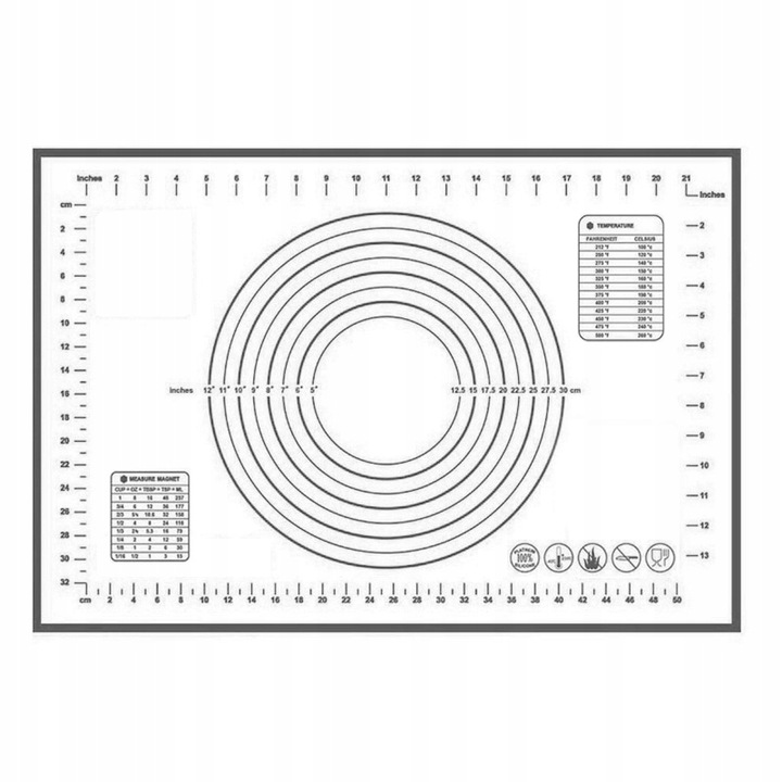 Кухонный коврик из стекловолокна с силиконовым покрытием. Помогает быстро приготовить выпечку и блюда, как горячие, так и холодные. На нем можно готовить не только торты – благодаря антипригарному покрытию никакие продукты не прилипнут к кондитерской доске.