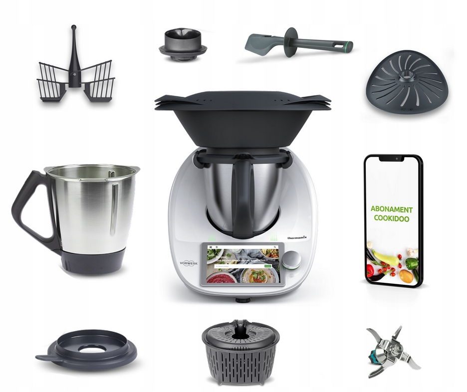Thermomix TM6 сочетает в себе 20 функций в одном компактном корпусе: взвешивает, смешивает, смешивает, эмульгирует, измельчает, смешивает, измельчает, измельчает, взбивает, замешивает, плавит, нагревает, кипятит, готовит на низкой и высокие температуры, приготовление на пару, жарение, тушение, карамелизация и подрумянивание и, самое главное, гарантирует отличные результаты приготовления. С помощью большого сенсорного экрана вы получаете доступ ко всем функциям и режимам приготовления, а также прямой доступ к платформе COOKIDOO.