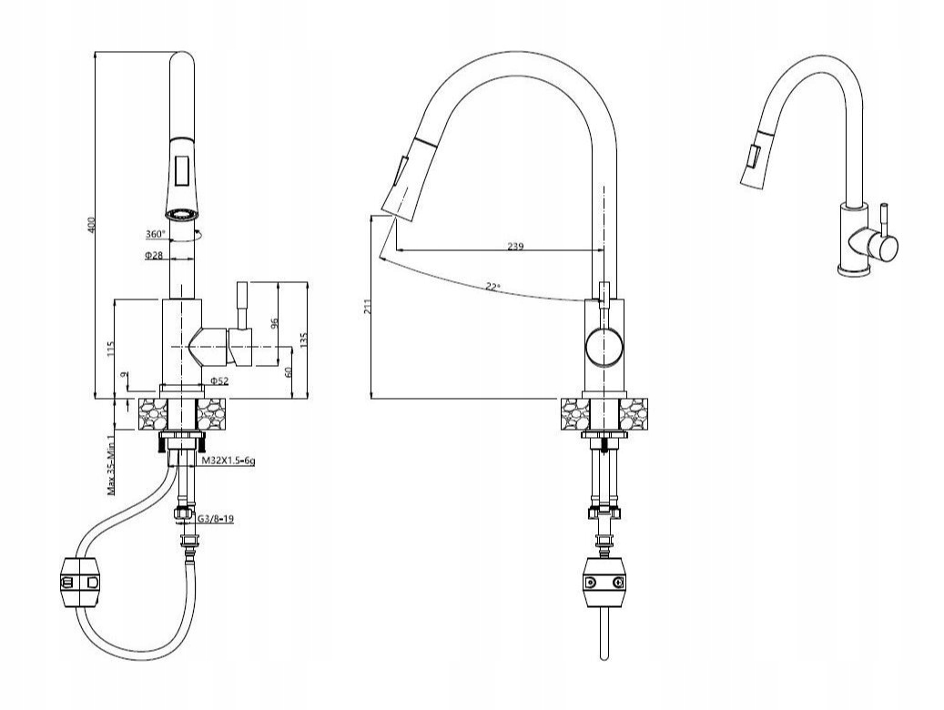 - Выдвижной излив с переключателем функции душа –идеально для мытья большой посуды
