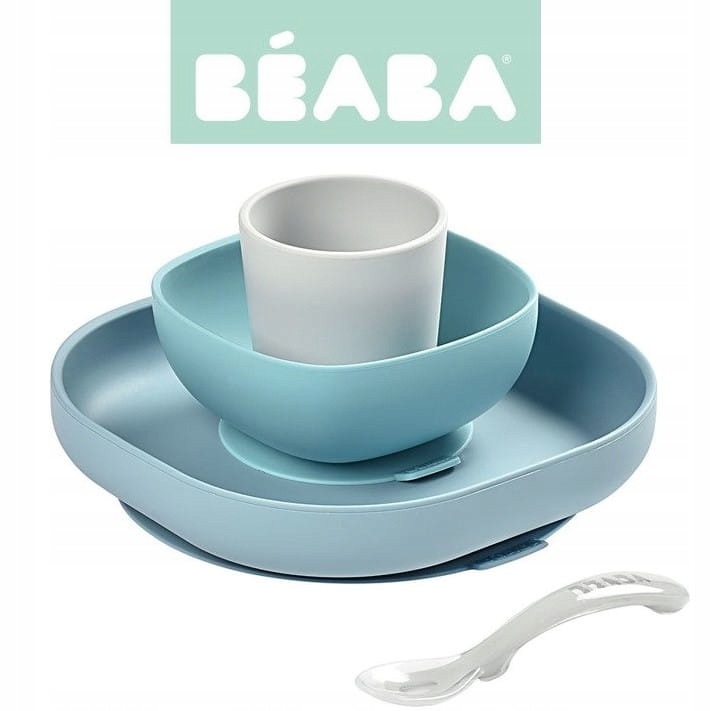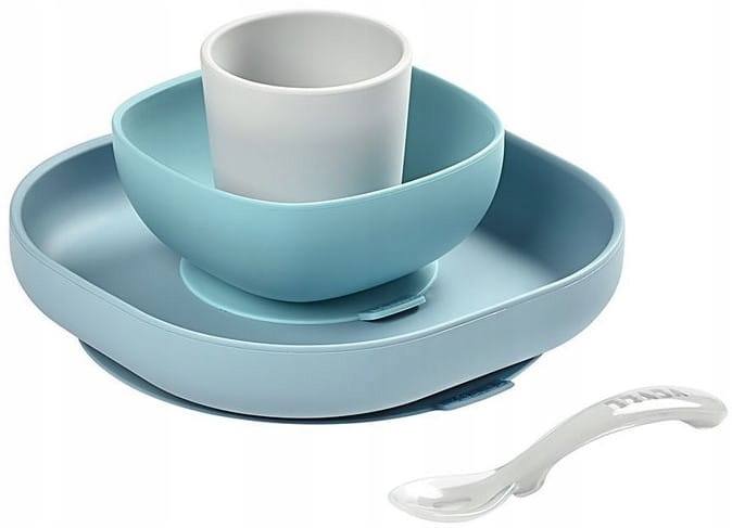 Набор силиконовой посуды от французского бренда BEABA состоит из тарелки, миски, чашки и обучающей ложки.