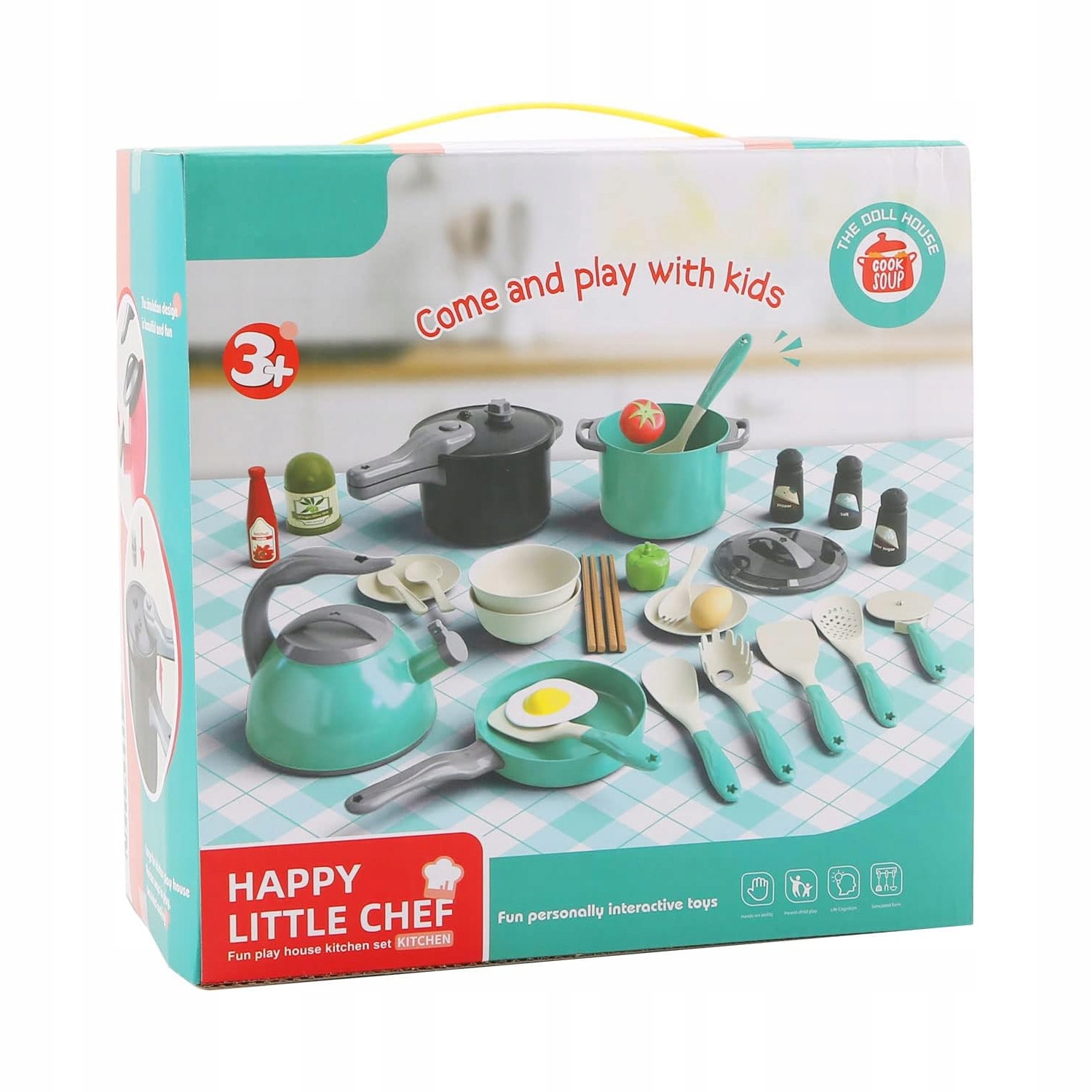 Красивый набор кастрюль, идеально подходящий для кухни маленького повара, развивающий его навыки ручного труда и позволяющий готовить множество различных блюд. Он оснащен набором кастрюль со съемными крышками и сковородой с крышкой. У чайника также есть съемная крышка и подвижный свисток, благодаря которому вы можете наполнить его водой. Приготовление облегчит входящая в комплект кухонная утварь, например, ложка для макарон или лопатка для сковороды. В набор также входят основные специи и ингредиенты для блюд, которые разнообразят удовольствие. Готовые блюда можно подавать на тарелках и пиалах, входящих в комплект.