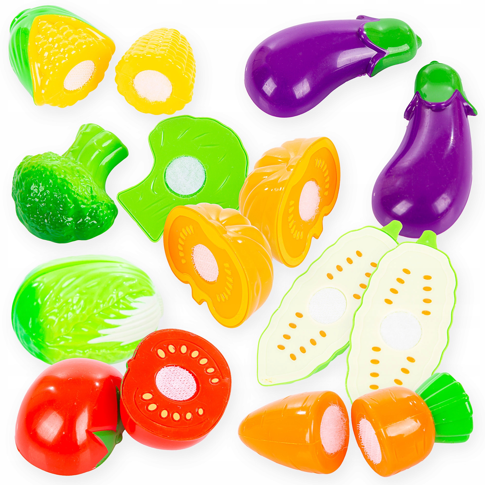 Овощи соединяются с помощью липучки, при разрезании липучка сопротивляется и издает звук, как при настоящей нарезке.