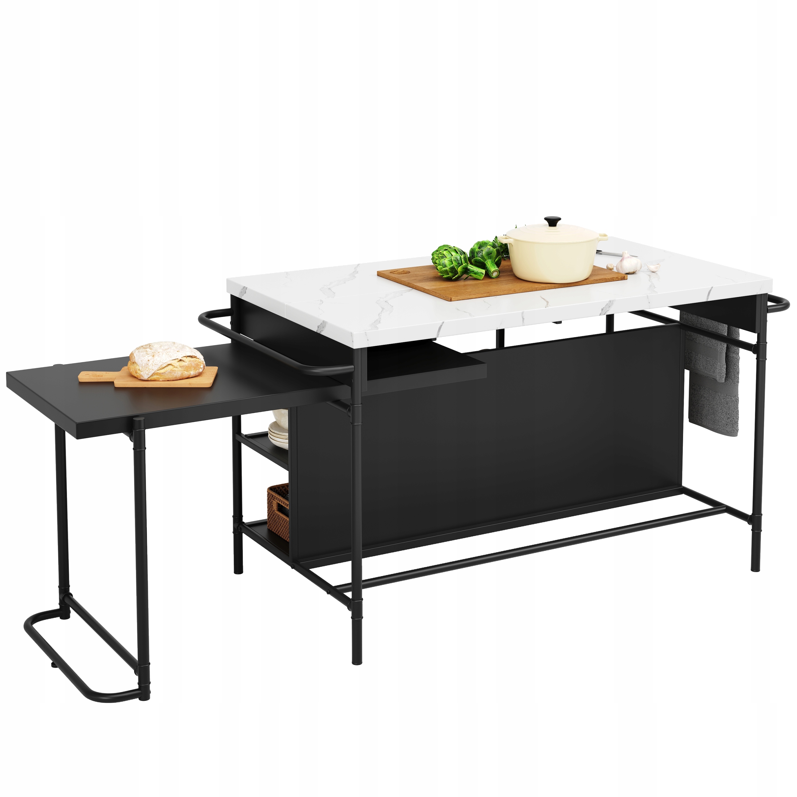 - Много места для хранения: Кухонный остров предлагает много места для хранения, в том числе три ящика для хранения в закрытии и двойные полки для различных повседневных предметов. Выдвижной верхушка обеспечивает большое пространство для хранения объектов.