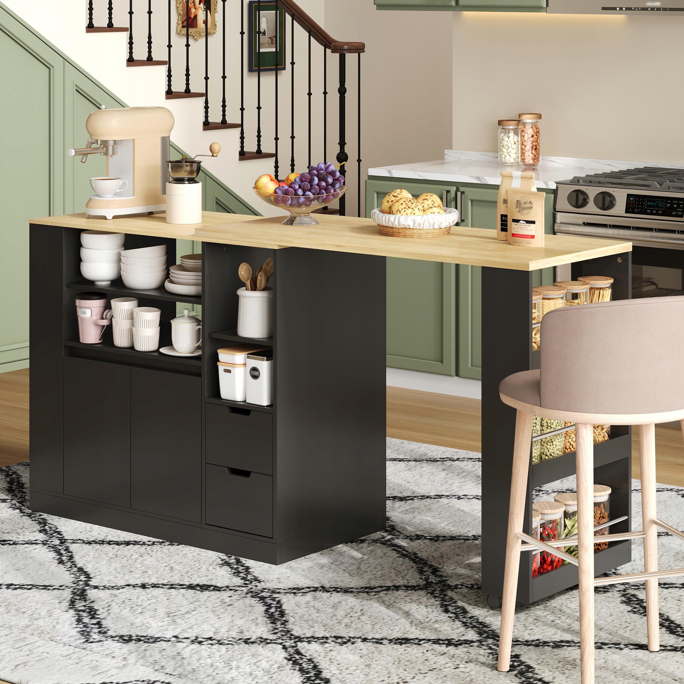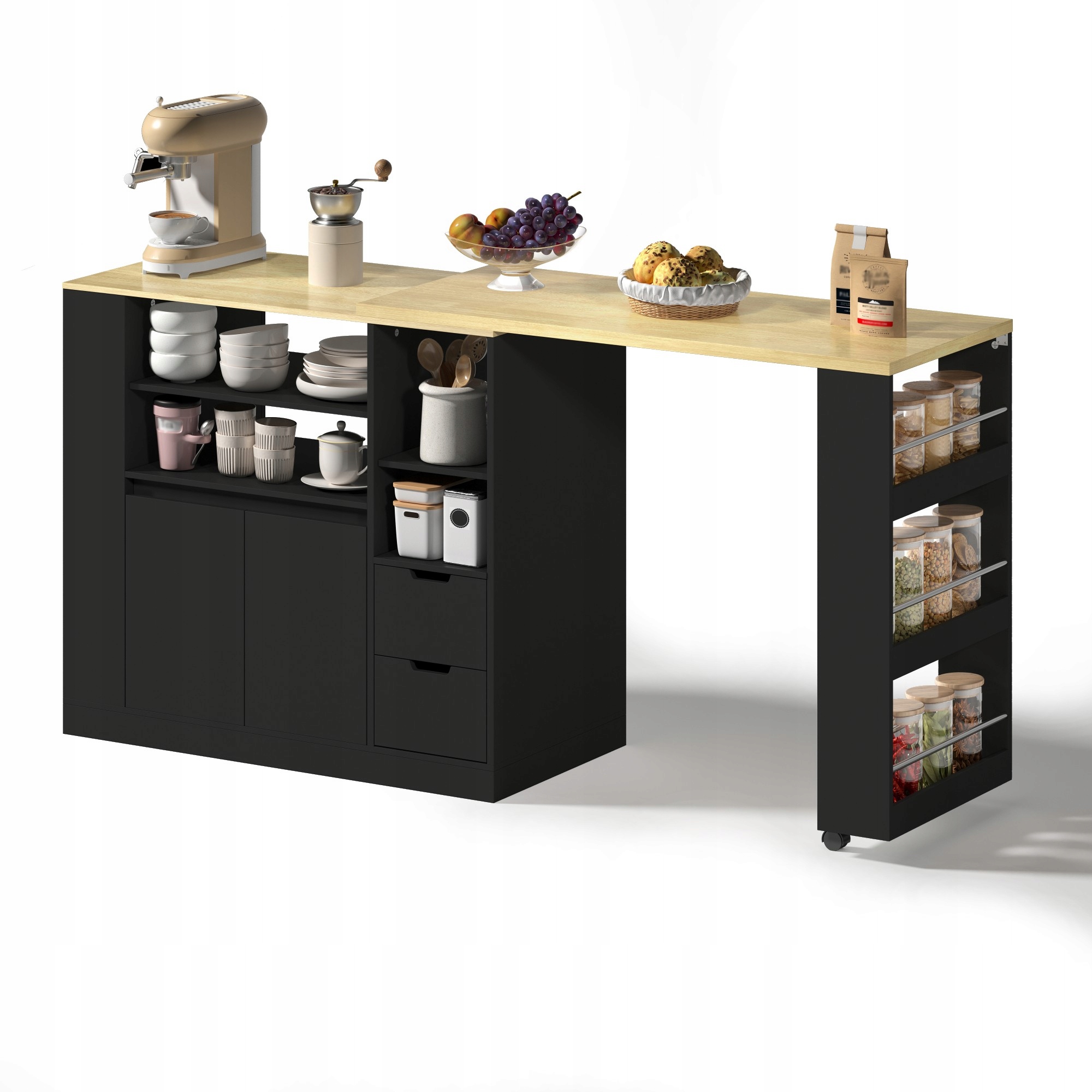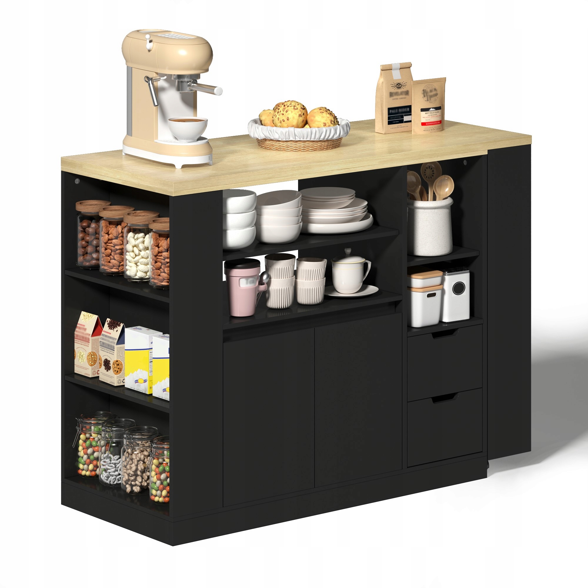 Большое пространство для хранения: остров размером примерно 115 x 50 x 92 см соединяет шкафы, ящики и полки, обеспечивая идеальный баланс между открытым и закрытым пространством для хранения. Держите кухонную утварь, тарелки и ингредиенты в порядке. Трехъярусная полка с правой стороны поворотной верхней части обеспечивает удобный доступ к специям, кофейным зернам и закускам, повышая эффективность работы на кухне.
