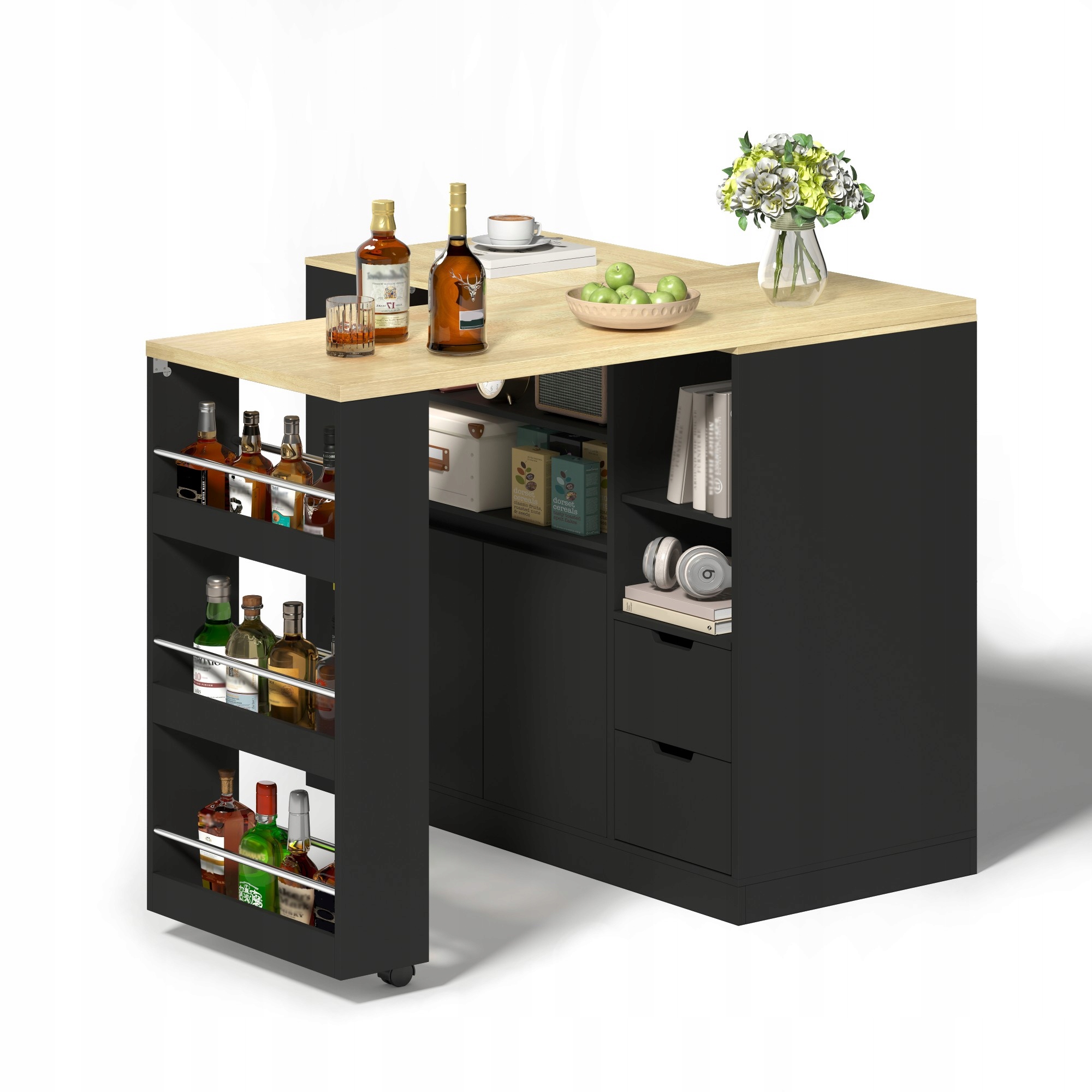 Новый дизайн: этот остров имеет уникальную поворотную и выдвижную верхнюю часть, которая адаптируется к различной планировке кухни. В разложенном виде остается достаточно места для приготовления еды; В сложенном виде экономит место на маленькой кухне. Поворотный механизм позволяет гибко адаптировать его к помещениям для хранения, приготовления пищи или столовой, обеспечивая максимальную универсальность.
