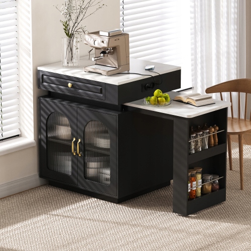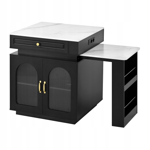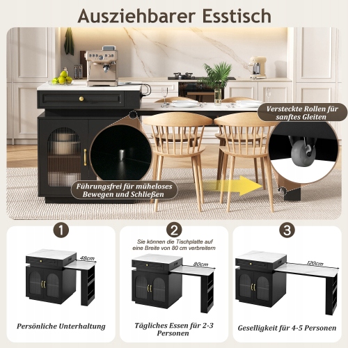 Современный дизайн: белая столешница, имитирующая мрамор, и черные шкафы с парящим дизайном создают поразительные контрасты. Золотые ручки и ребристые стеклянные дверцы подчеркивают высокое качество изготовления. Закругленные углы смягчают края и обеспечивают гладкую поверхность. Скрытые колеса в основании подчеркивают чистые линии. Этот раздвижной стол идеально вписывается в скандинавский и минималистский интерьер в качестве обеденного стола или кухонного острова, становясь настоящей изюминкой.