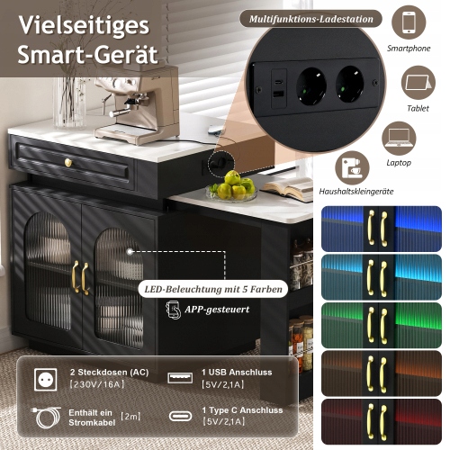 Универсальное, интеллектуальное устройство: обеденный стол оснащен встроенным светодиодным освещением с 5 цветовыми режимами, что создает уютную атмосферу. Эффекты светодиодной подсветки различаются в зависимости от цвета шкафа. Многофункциональная зарядная станция (USB/Type-C) позволяет заряжать устройства прямо на месте. Отверстия для прокладки кабелей на задней панели обеспечивают порядок на рабочей поверхности — практично, эстетично и полностью подключено.