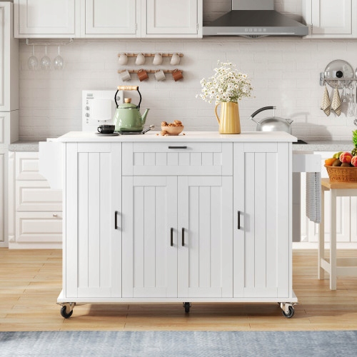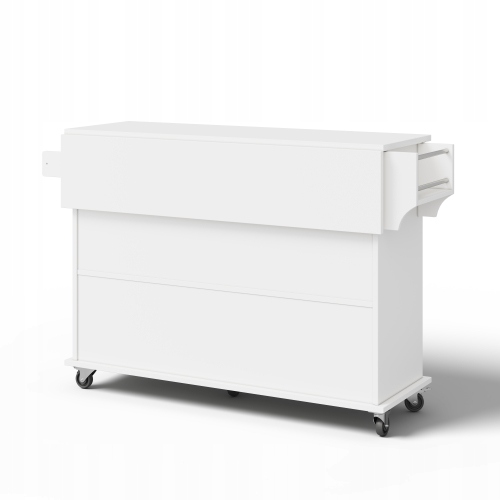 Кухонный остров со складной столешницей, кухонная тележка на колесах, кухонный шкаф с 4 дверцами и 1 ящиком, встроенные полочки для специй в дверцах, вешалки для полотенец двухсторонние, белый, 120×45(70)×95