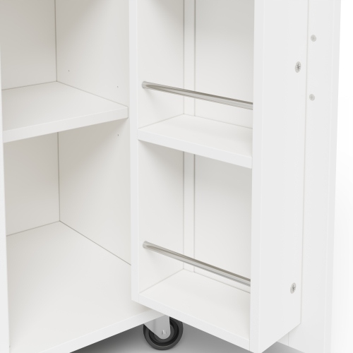 Тележка имеет 4 дверцы, 2 из которых оснащены встроенными полками для специй и мелких предметов. За дверцей регулируемые полки позволяют организовать персонализированную организацию. Боковые полки и держатели для полотенец обеспечивают аккуратное и доступное хранение с обеих сторон.