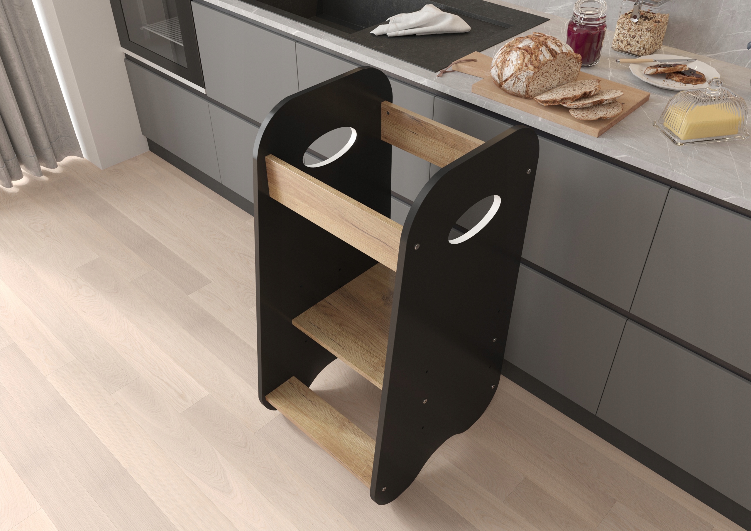Наш кухонный помощник произведен в Польше. Он легкий и стабильный. Защищенная платформа регулируется по двум высотам: 22 см и 30 см от пола, благодаря чему она прослужит вашему ребенку дольше. Изделие изготовлено из качественного материала, такого как мебельный щит.