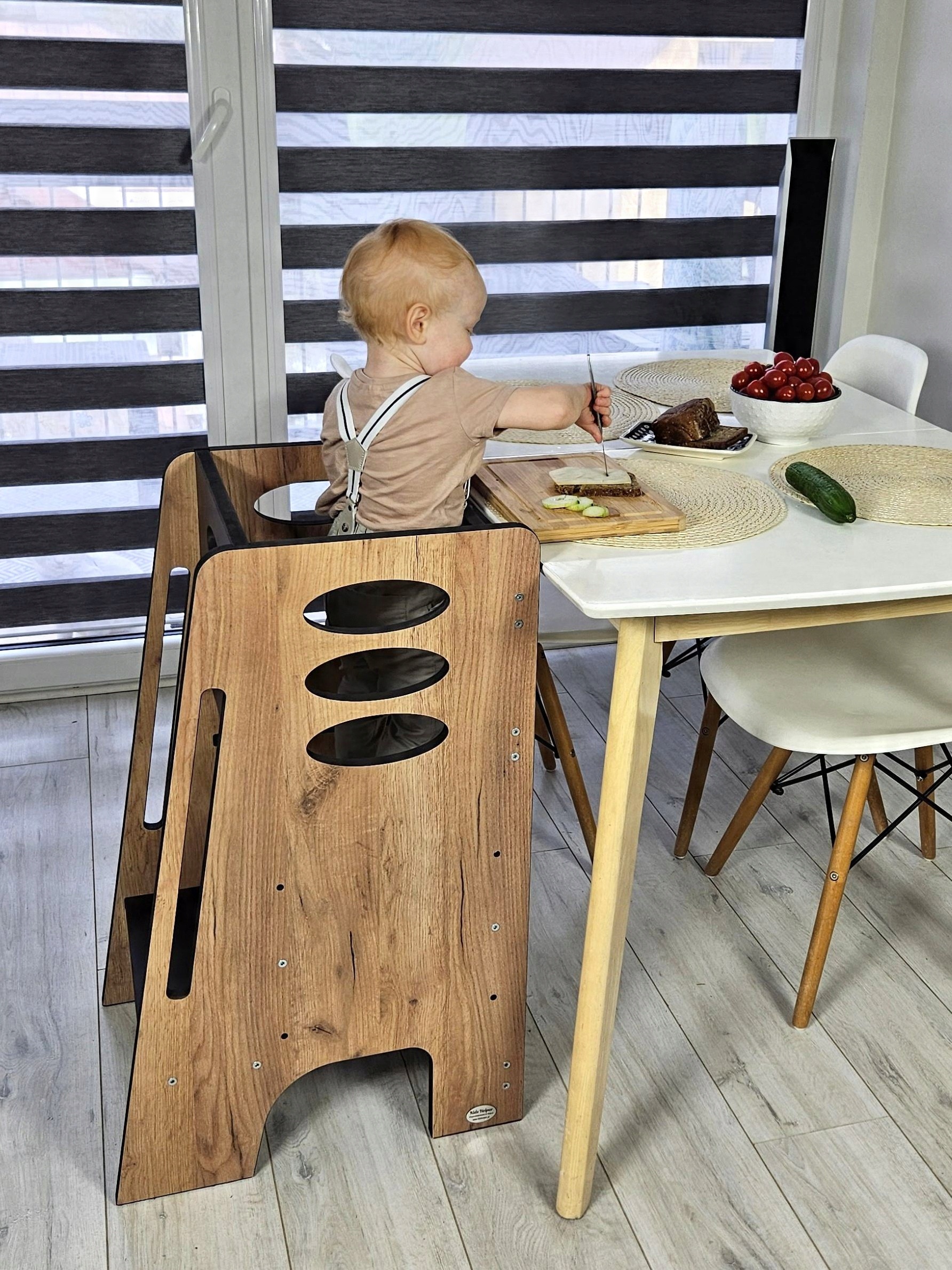 Наш кухонный помощник — это надежный продукт, который полностью производится в Польше. Мы построили его из ламинированных плит МДФ, крашенных в черный цвет, что делает его устойчивым и безопасным. Все было обработано вручную, чтобы ни один острый край или выступающая заноза не представляли угрозы для ребенка.