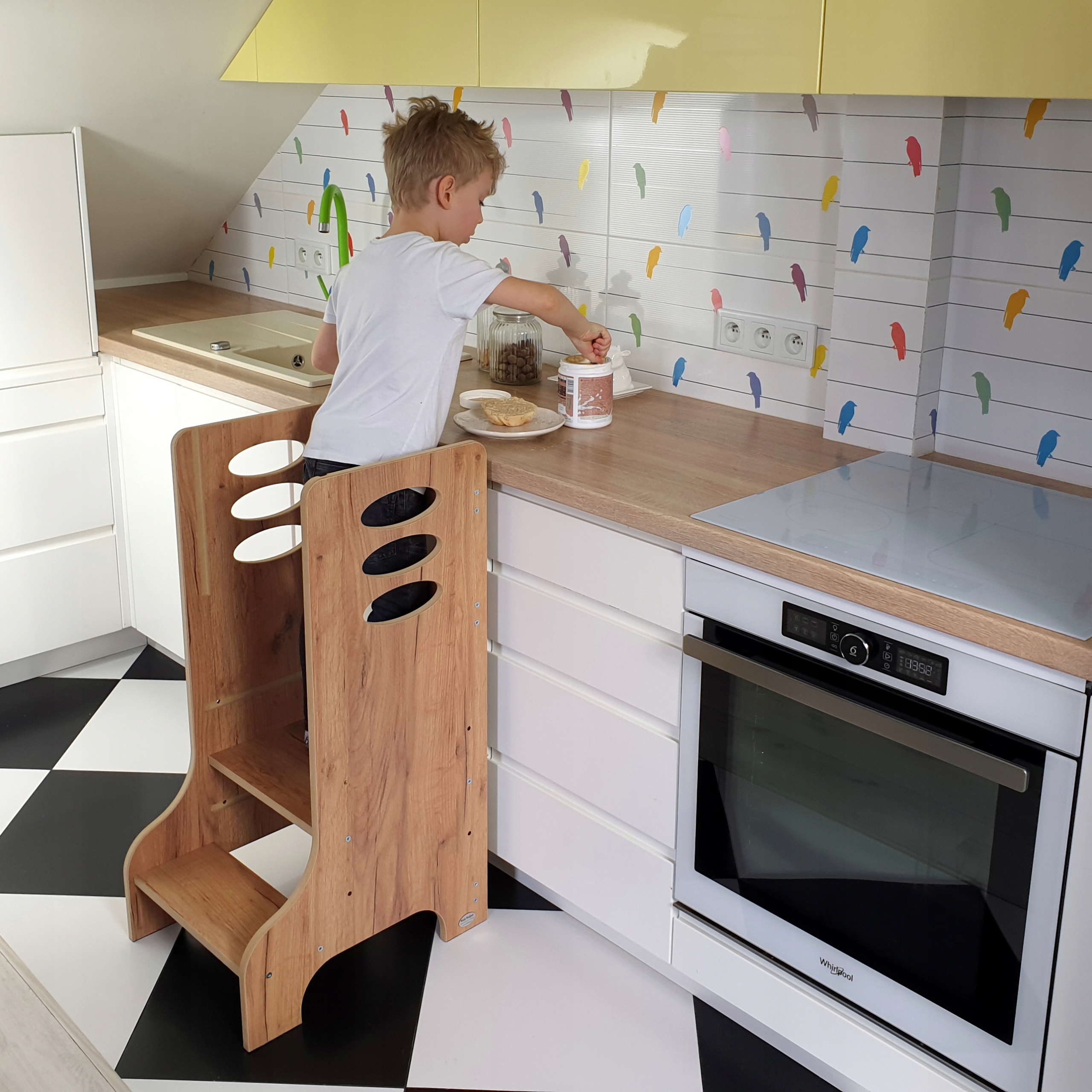 Наш кухонный помощник — это прочный продукт, полностью производимый в Польше. Мы построили его из ламинированных плит МДФ, что делает его устойчивым и безопасным. Все это было обработано вручную, чтобы ребенку не угрожали ни острые края, ни выступающие занозы.