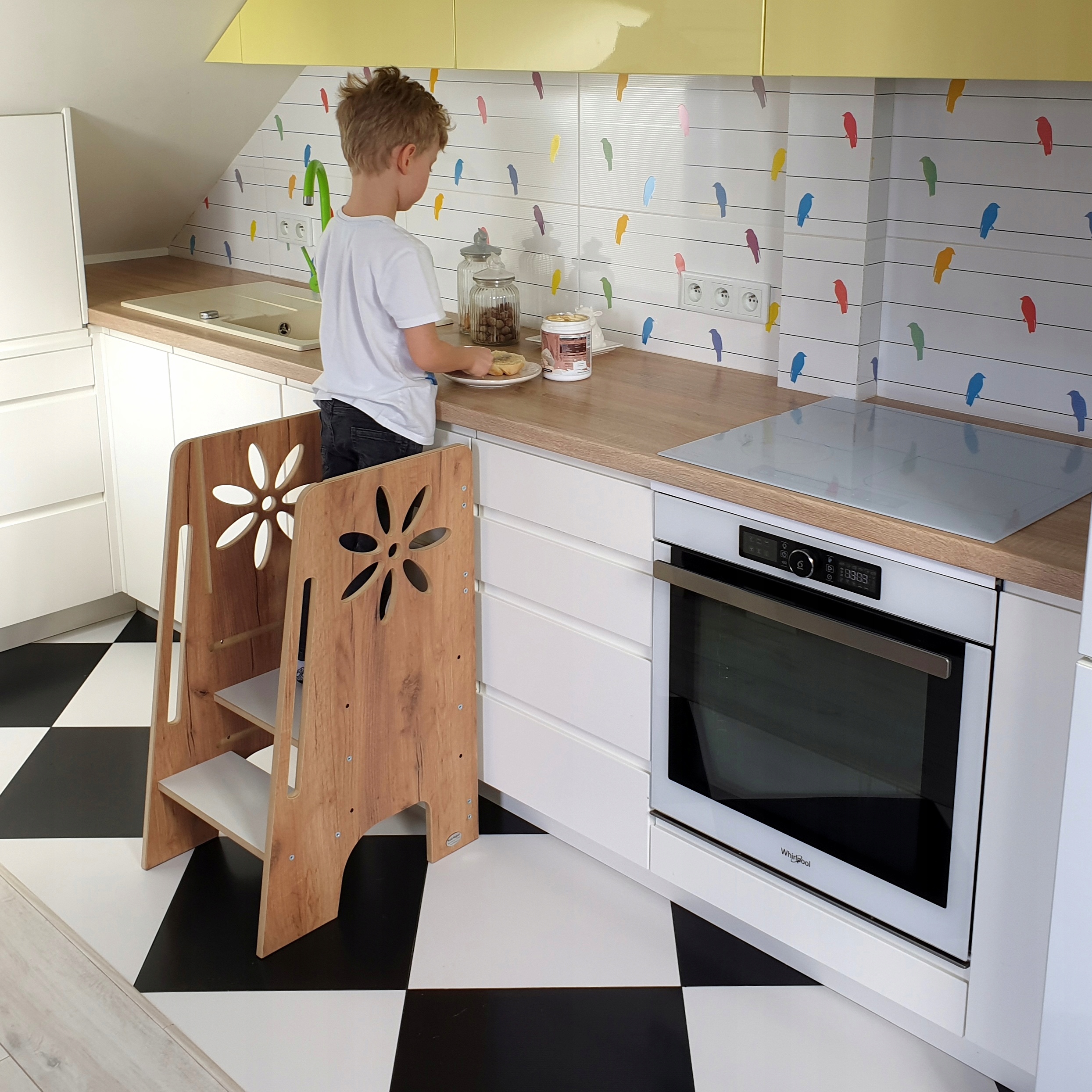 Наш кухонный помощник — это надежный продукт, который полностью производится в Польше. Мы построили его из ламинированных плит МДФ, что делает его устойчивым и безопасным. Все это было обработано вручную, чтобы ни один острый край или выступающая заноза не представляли угрозы для ребенка.