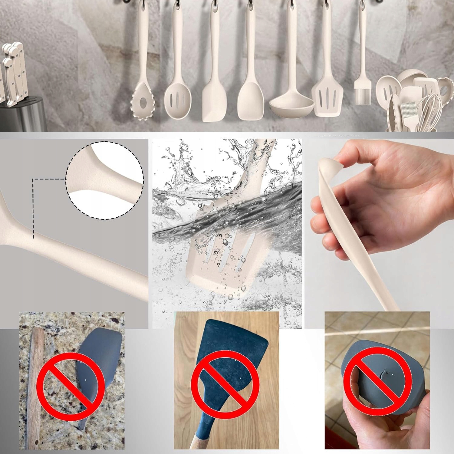 🫧 Голова из силикона делает, что не поставленные кухонные утвари не поцарапаны или отрицаются, И каждый аксессуар для приготовления пищи имеет небольшое отверстие в конце ручки, чтобы облегчить подвеску на стене. Изготовлен из силикона, безопасного для пищи без опасных веществ, температурный устойчивость к 210 ° C/450 ° F, не беспокоясь о том, что силиконовая часть будет растопить пищу во время приготовления. b> 🍛 Профессиональная конструкция