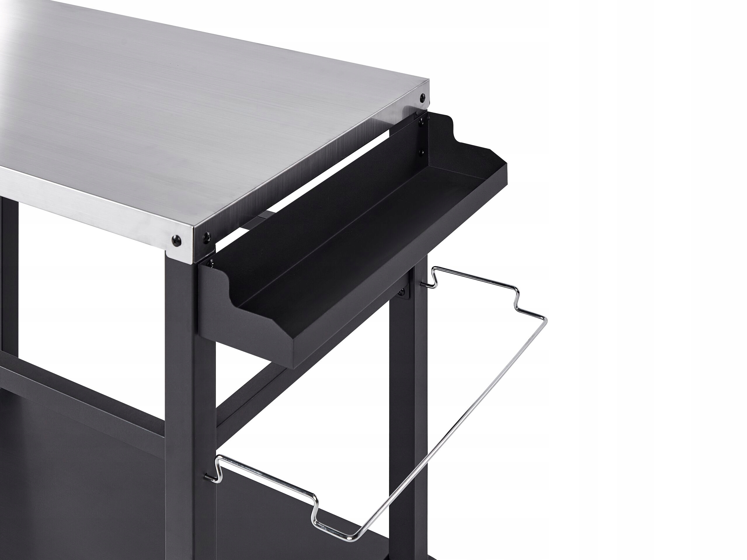 Стильная сервировочная тележка сделает зону отдыха в саду более функциональной. Стальной каркас с порошковым покрытием обеспечивает устойчивость, а столешница из нержавеющей стали — мечта каждого шеф-повара благодаря ее долговечности и простоте очистки. Практичный держатель для полотенец и вешалки для различных аксессуаров позаботятся о том, чтобы все необходимое было под рукой. Нижняя полка идеально подходит для хранения посуды или продуктов питания. Благодаря колесам коляску можно легко передвигать, что делает ее незаменимой частью вечеринки на свежем воздухе.