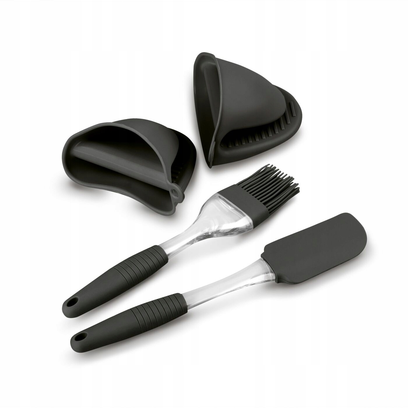 Комплект состоит из 4-х элементов. В комплект входят 2 силиконовые лапки, силиконовая лопаточка для крема и силиконовая кухонная щетка. Качество набора обеспечивает высокую долговечность и безопасность использования. Черные кухонные аксессуары из силикона хорошо справляются с эксплуатацией при высоких температурах (от -20 до 220 градусов С). Они помогут вам приготовить торты, обеды, барбекю или переместить нагретую форму для торта или сковороду. Их легко хранить, поскольку их можно подвешивать. Их можно мыть в посудомоечной машине. Силикон хорошо защищает набор посуды от проникновения ароматов, пятен и грязи.
