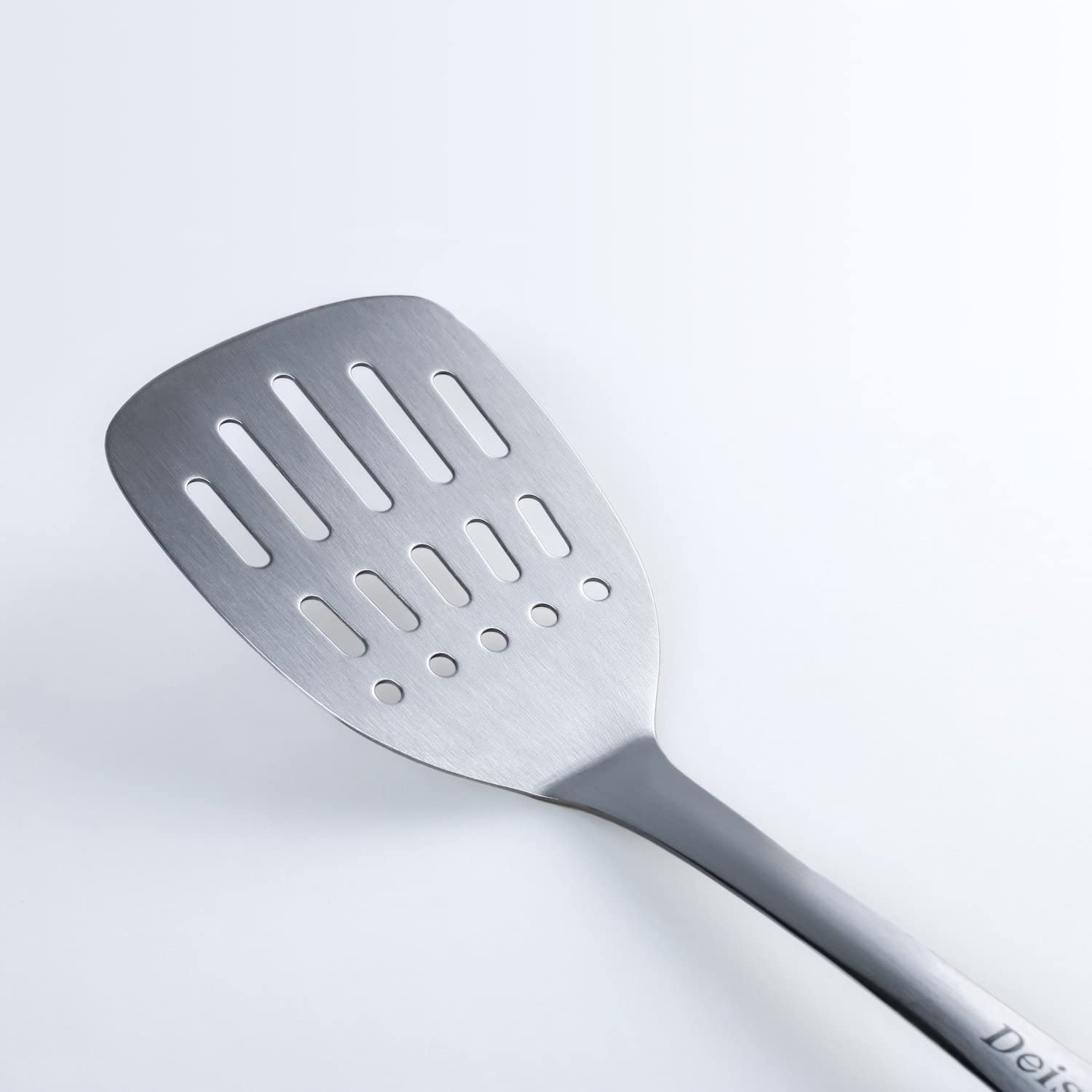 - ИДЕАЛЬНО ДЛЯ ПОВСЕДНЕВНОЙ ГОТОВКИ: Deiss — это кухонная лопатка из нержавеющей стали с плоским передним краем, на которую легко помещаются любые продукты. Металлической лопаткой можно жарить овощи, переворачивать мясо, готовить яичницу и многое другое. При приготовлении макарон можно использовать металлическую кухонную лопатку, чтобы проверить вкус, поскольку макароны можно легко взять и слить воду через отверстия в головке устройства.